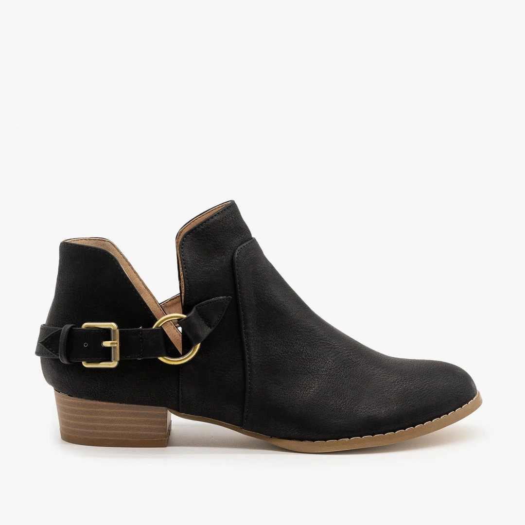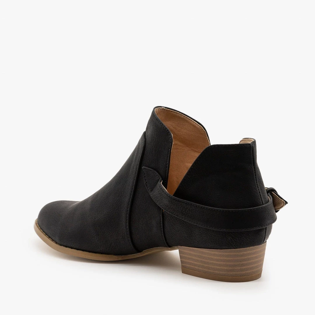 Put some pep in your step with the AMS Shoes Escape-5 ankle booties! These beautiful booties are made out of faux suede (stone) or faux leather (mocha, taupe) and feature a 1.25″ stacked heel, giving you enough style and height to complete your outfit. The rounded toe makes it easy to wear these shoes all day long, while the slip-on style allows for easy on/off access. The trendy side cutouts also give these booties some extra style and sass, while the belted accent that goes around the back of the shoe gives these shoes a bit of edge. You can wear these booties with just about anything in your closet! Pair them with some distressed ankle jeans and a vintage band tee for a cool and casual look, or with a flowy midi dress for a sweet bohemian look! Made with all man-made/vegan materials.