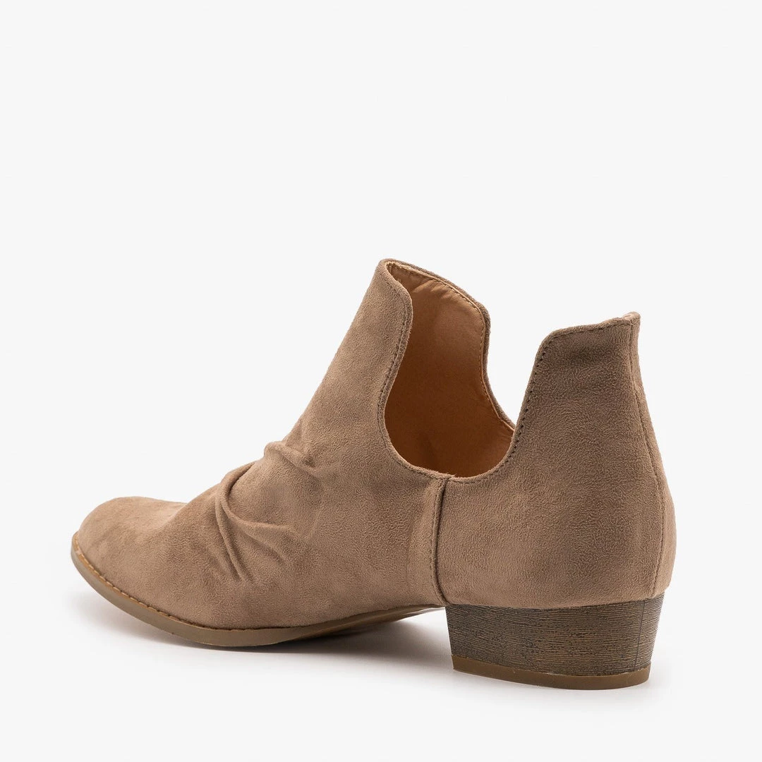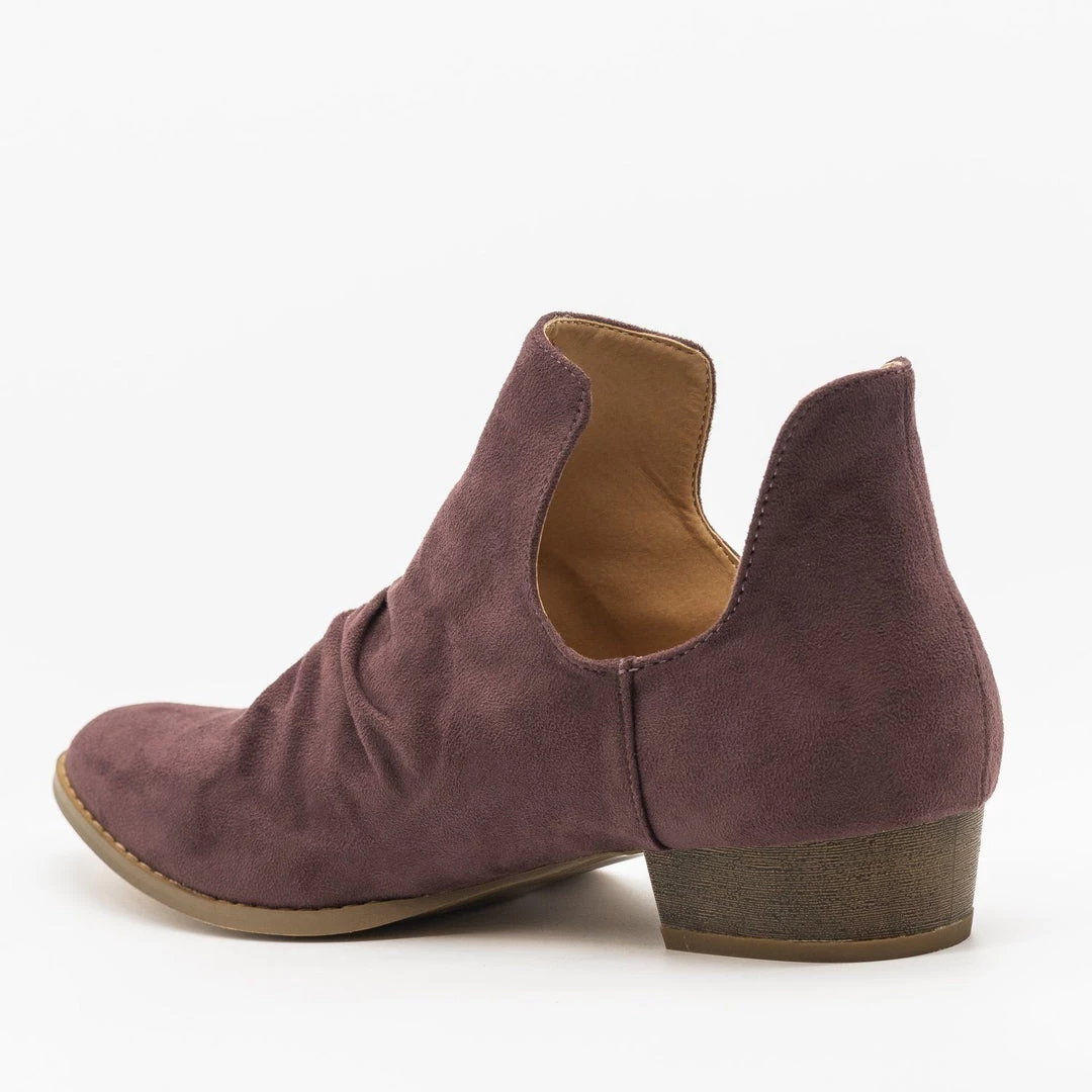 Kick up your heels in the AMS Shoes Glory-1 ankle booties! These beauties are crafted out of faux suede and feature a 1″ block heel and a posh almond-shaped toe, making these shoes great to wear all day, everyday. The trendy U-shaped side cut-outs add a bit more style to these already fashionable booties, and the dainty studded accents on the exterior side of the shoe give these booties a lovely, fashionable look. These booties also feature a scrunched design on top of the booties, which give these shoes a gorgeous, vintage look. These booties will go great with just about every outfit you put together! Wear these booties with some raw hem ankle jeans and a knotted vintage band tee for a cool and casual outfit! You can even pair them with a flowy midi dress for a truly bohemian look! Made with all man-made/vegan materials.