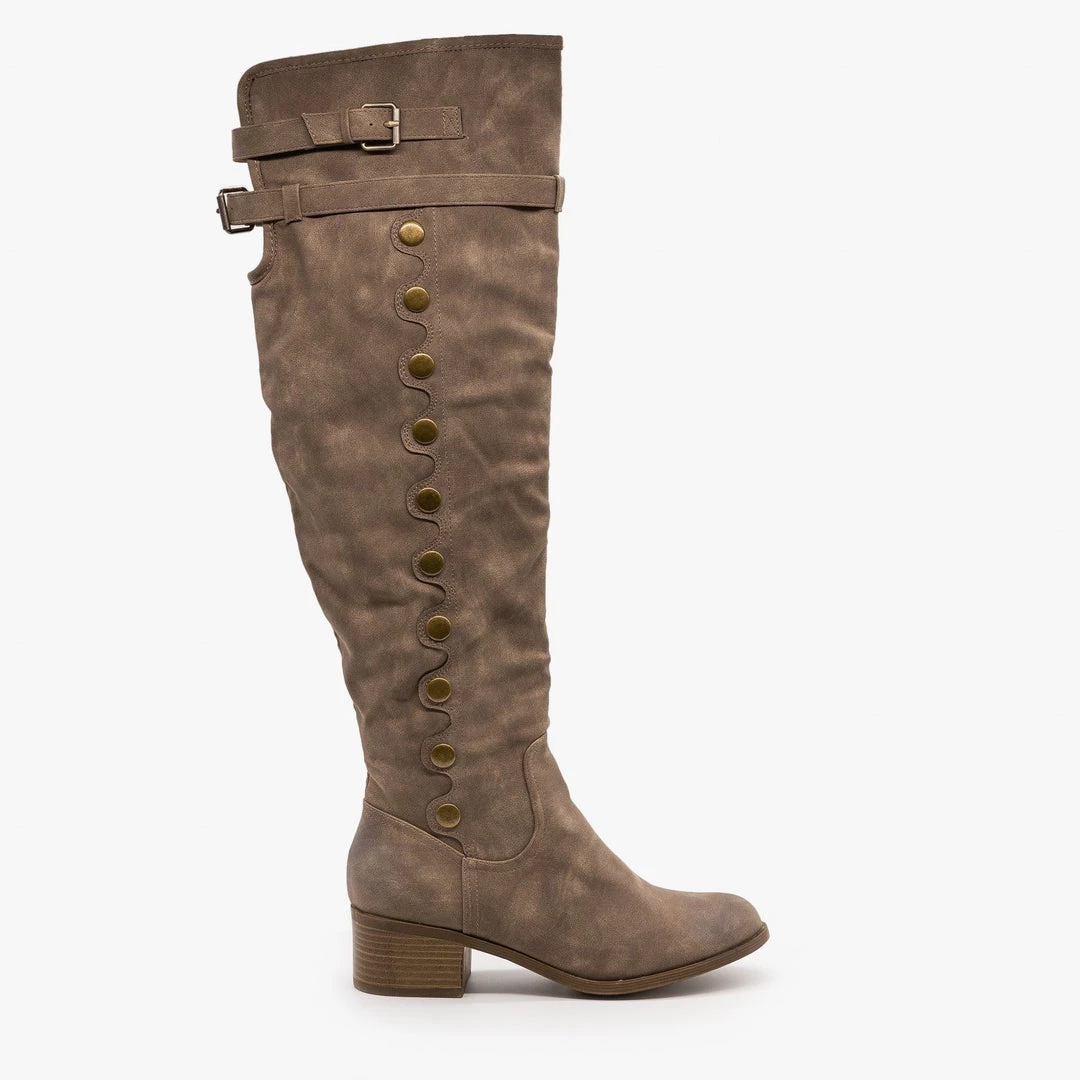 We can’t get enough of these fabulous AMS Shoes Confidence-5 knee high boots! Crafted with soft, lightly distressed faux leather, these boots feature an approx. 2.5″ stacked heel and a cute almond shaped toe. The body of the boot features large metallic studs on scallop-style detailing and a double band and buckle around the top of the boot add the perfect finishing touches. A half-length inside zipper makes putting these boots on and taking them off super easy despite their height. Pair these boots with a bodycon dress and cropped leather jacket for a glamorous fall look! Made with all man-made/vegan materials and runs true to size.