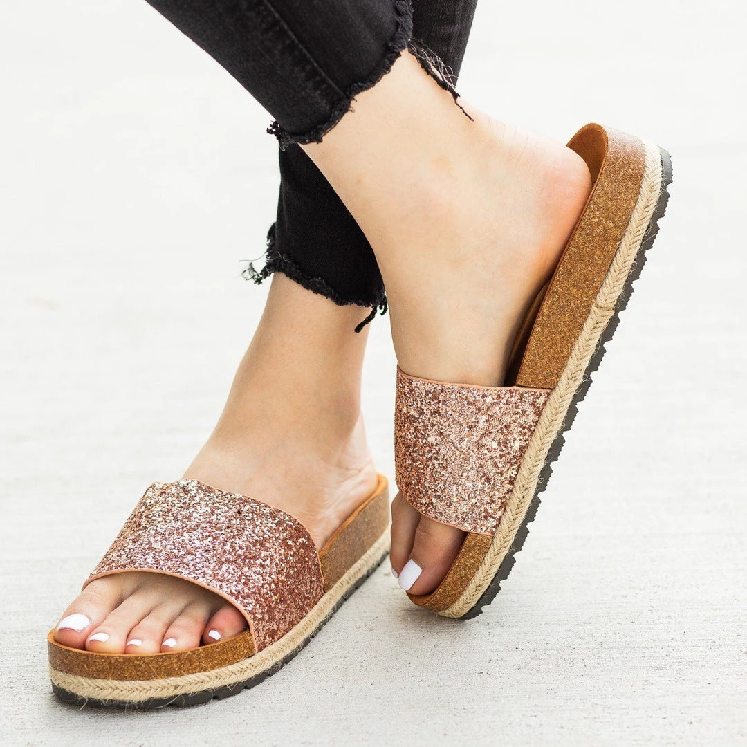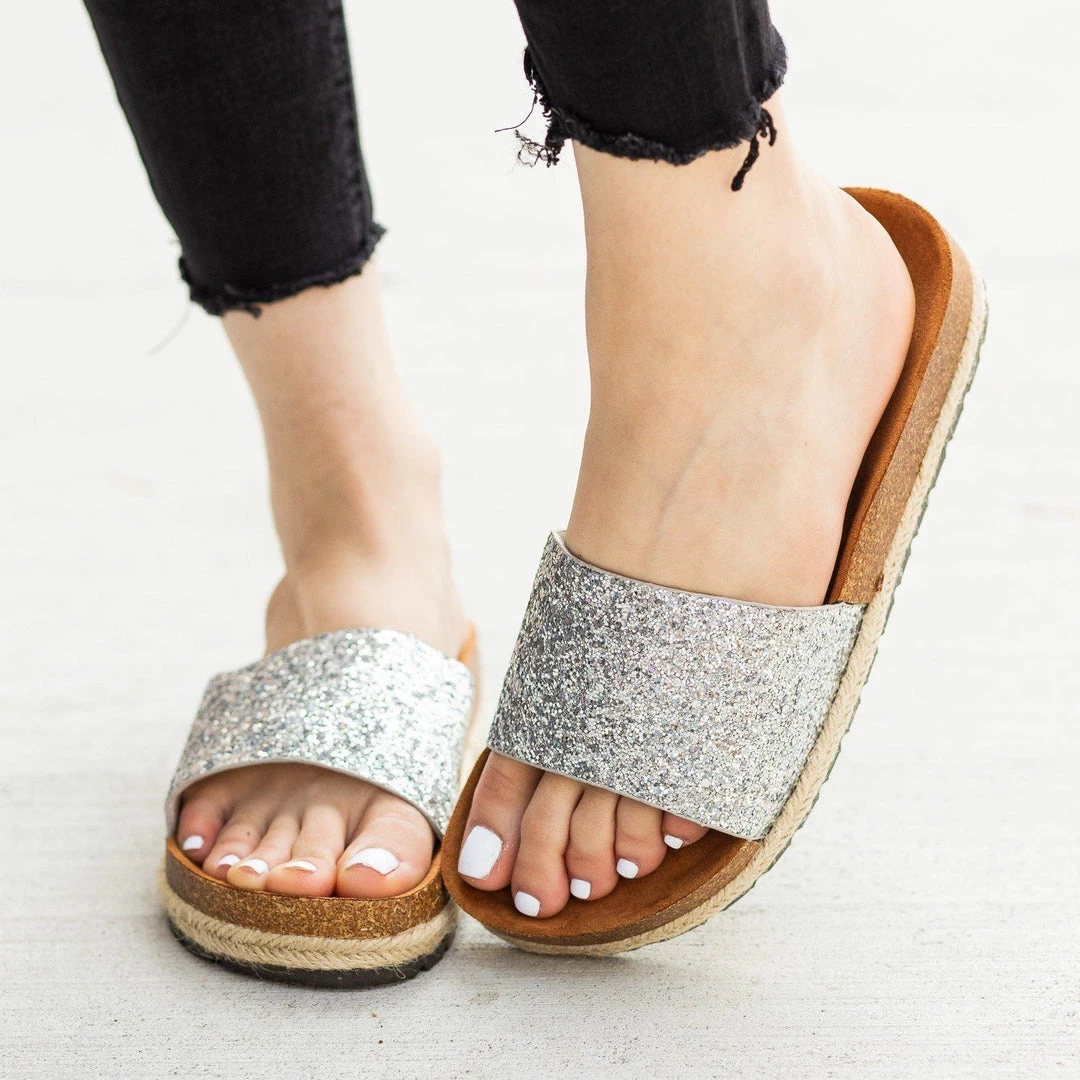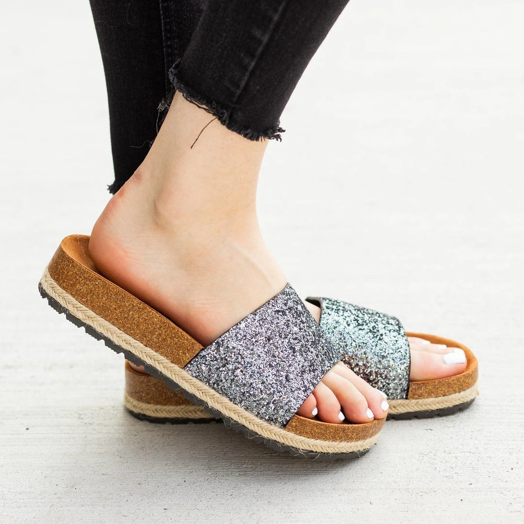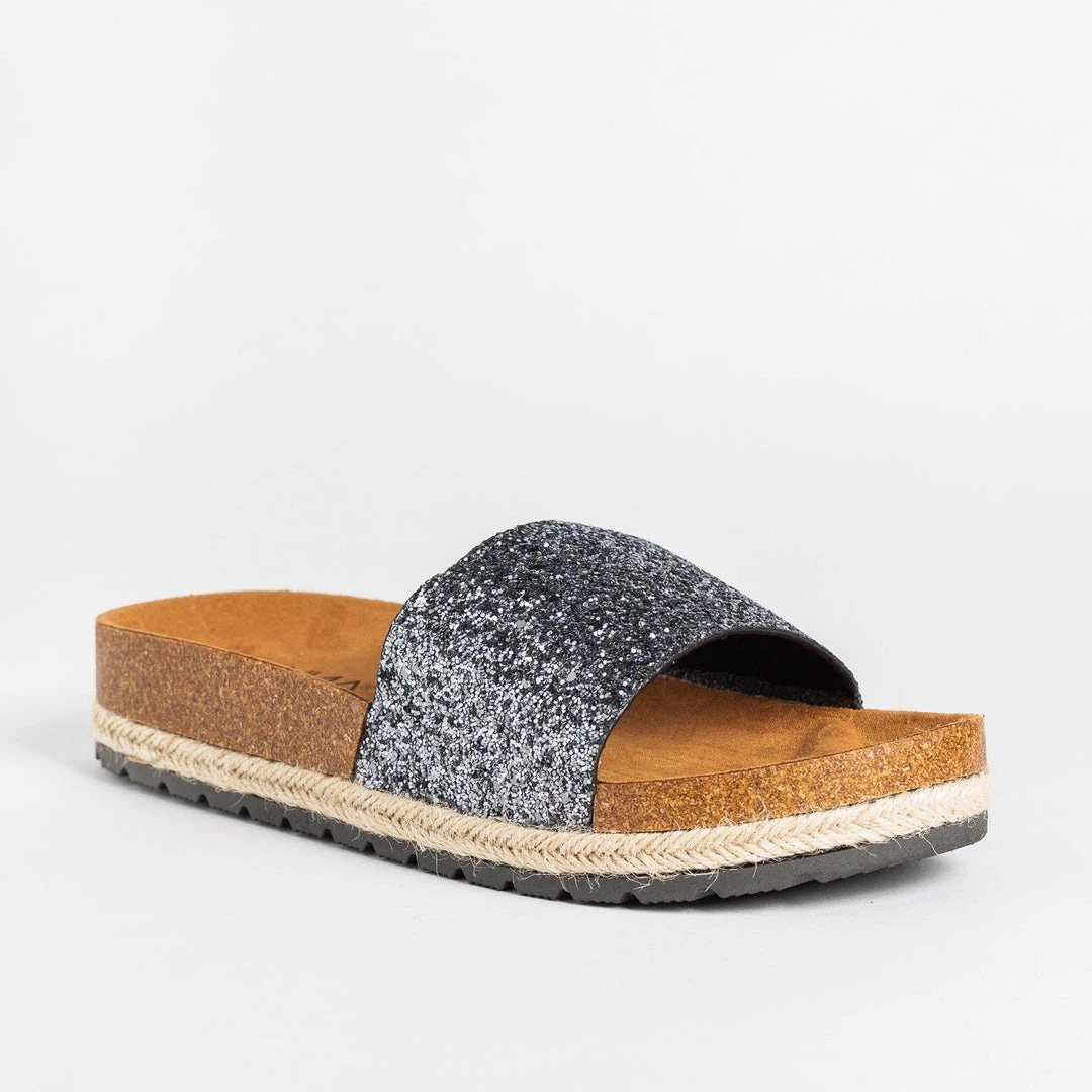 Add some sparkle and shine to your outfits with these Anna Shoes Javier cork slides! These slides feature an easy-to-wear slip-on design and a formed cork insole for maximum comfort. The espadrille trim gives these shoes a trendy look, while the thick glitter strap is the perfect finishing touch to these gorgeous sandals. Wear these slides with some cuffed high-waisted boyfriend jeans and knotted cropped tee for a super cute everyday look! Made with all man-made/vegan materials.