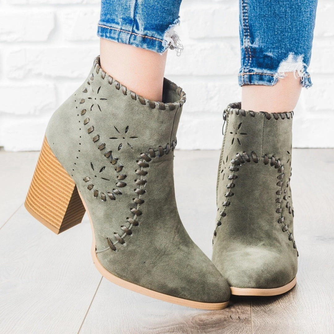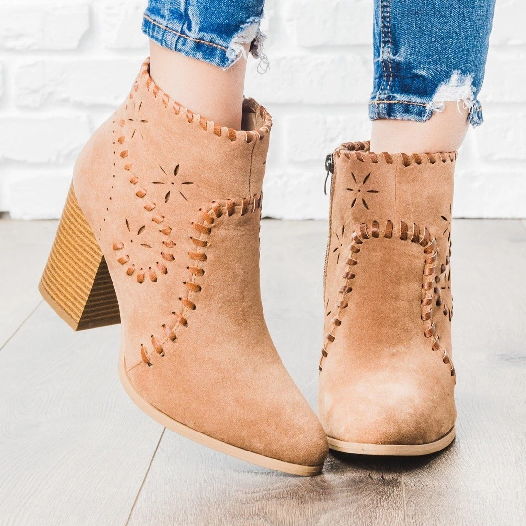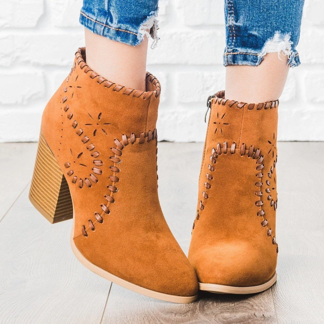 Transition into fall with these darling ankle booties! The Arider Girl Shoes Angela-02 features an almond toe, laser cut stars and pinhole accents, stitched details all around the shoe, and a 3.5” stacked heel. The faux suede gives a nice, soft autumn look and these are completed with a side zipper. These booties are adorable with their boho flare! Made with all manmade/vegan materials and runs true to size.