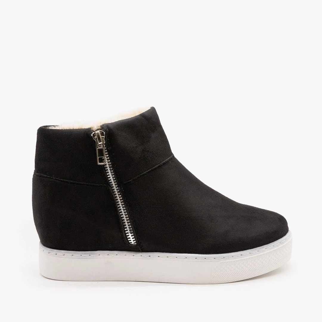 Don’t let the colder months stop you from strutting your stuff! The Bamboo Shoes Rise-02 sneaker wedges are lined with a faux fur to keep you warm and comfortable. The outer ankle has a decorative zipper to give some edge, and an inner zipper is included for easy entry. A subtle seam extends around the circumference of the ankle, giving it a more tailored silhouette. The 1″ platform and 2″ hidden wedge will give you the perfect boost in height while keeping you comfortable! Combine with fitted cargo pants and a fashion hoodie! Made with all man-made/vegan materials and runs true to size.