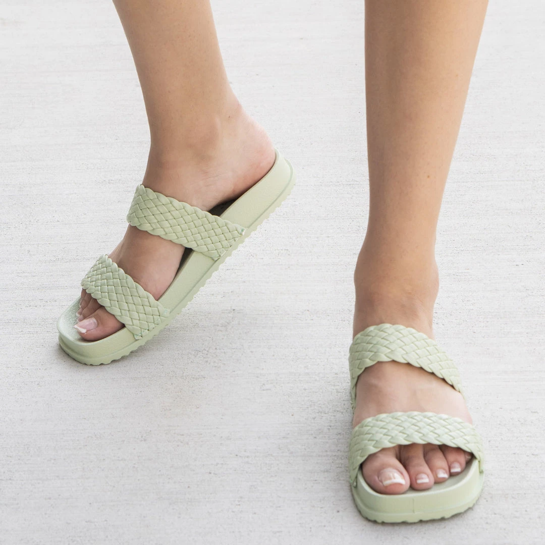 Get the perfect lounging shoe with our Bamboo Media-03 slides. They are crafted from a faux-leather material and feature a double strapped design with braided texture. They have a squared-toe front and form fitting sole that provides comfort and style. Pair with biker shorts and an oversized graphic T for a trendy street fashion inspired look.Â
