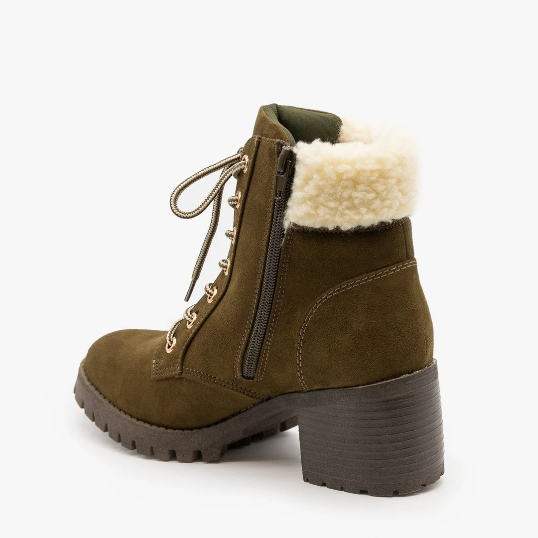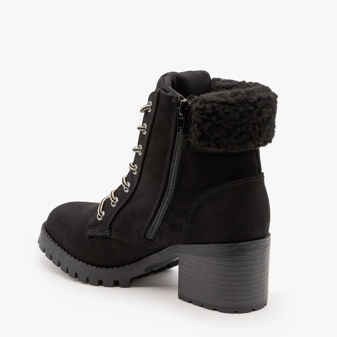Bundle up with the Bamboo Shoes Chief-19 ankle booties! Crafted with faux suede, these booties feature a sherpa lined ankle detail that will keep you comfortably chic in the colder months. A lace-up front gives the classic boot silhouette while an inner zipper is added for easy entry. The 2″ chunky heel and treaded bottom will have you stomping the streets like a runway! Combine with black denim, a fitted turtleneck, and denim jacket for a rustic twist. Made with all man-made/vegan materials and runs true to size.