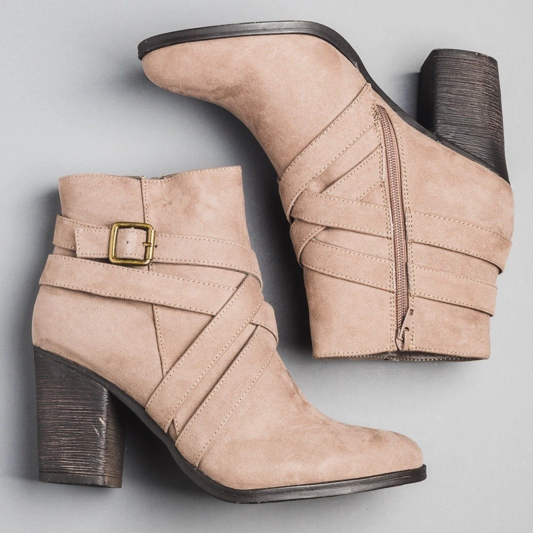 Perfect for this fall season! These booties are crafted in faux suede and have beautiful criss cross strap buckle detail. Features a 3.5″ block heel and zipper closure for convience. These are running true to size.