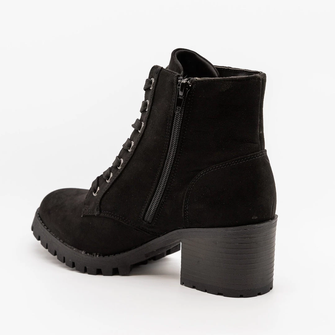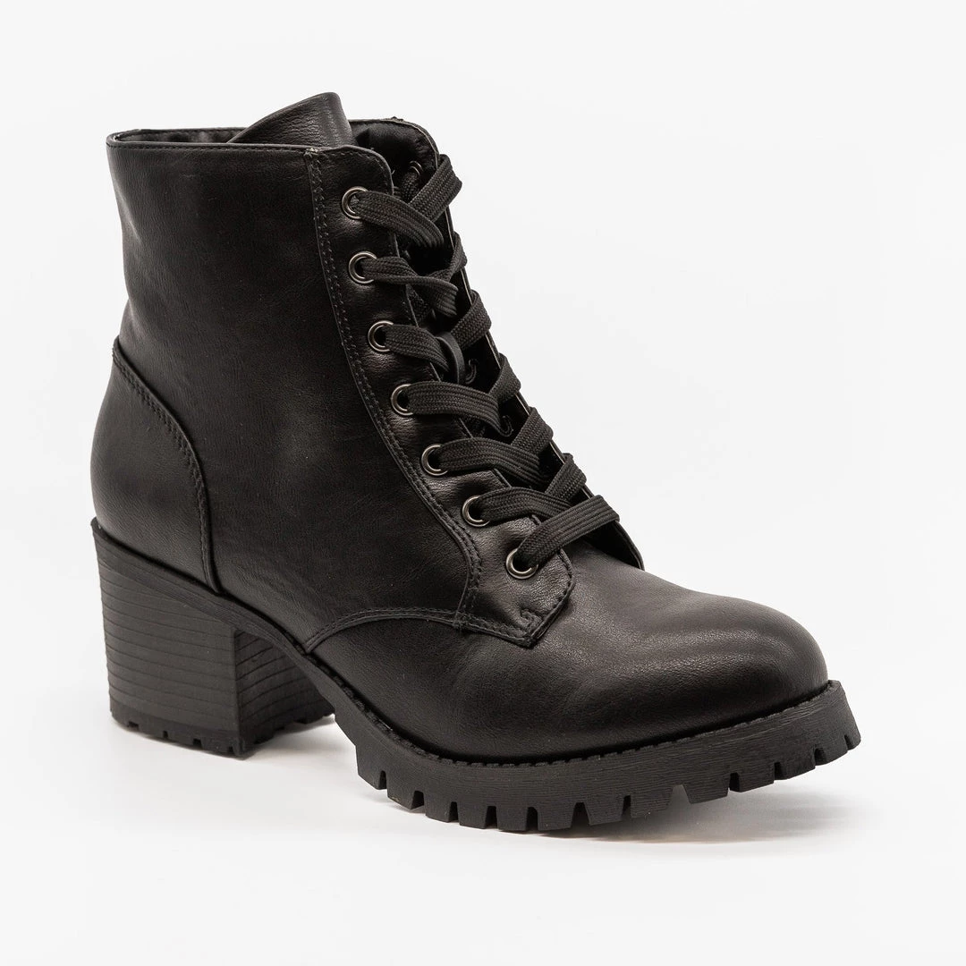 Make the sidewalk your stomping ground with the Bamboo Shoes Chief-02 combat booties! These booties feature a decorative laced front with an inner side zipper for easy entry. A 2.5″ stacked heel and lug sole combines the perfect amount of fashion and edge. These booties pair perfectly with a long sleeve turtleneck layered with a corduroy overall dress. Made with all man-made/vegan materials and runs true to size.