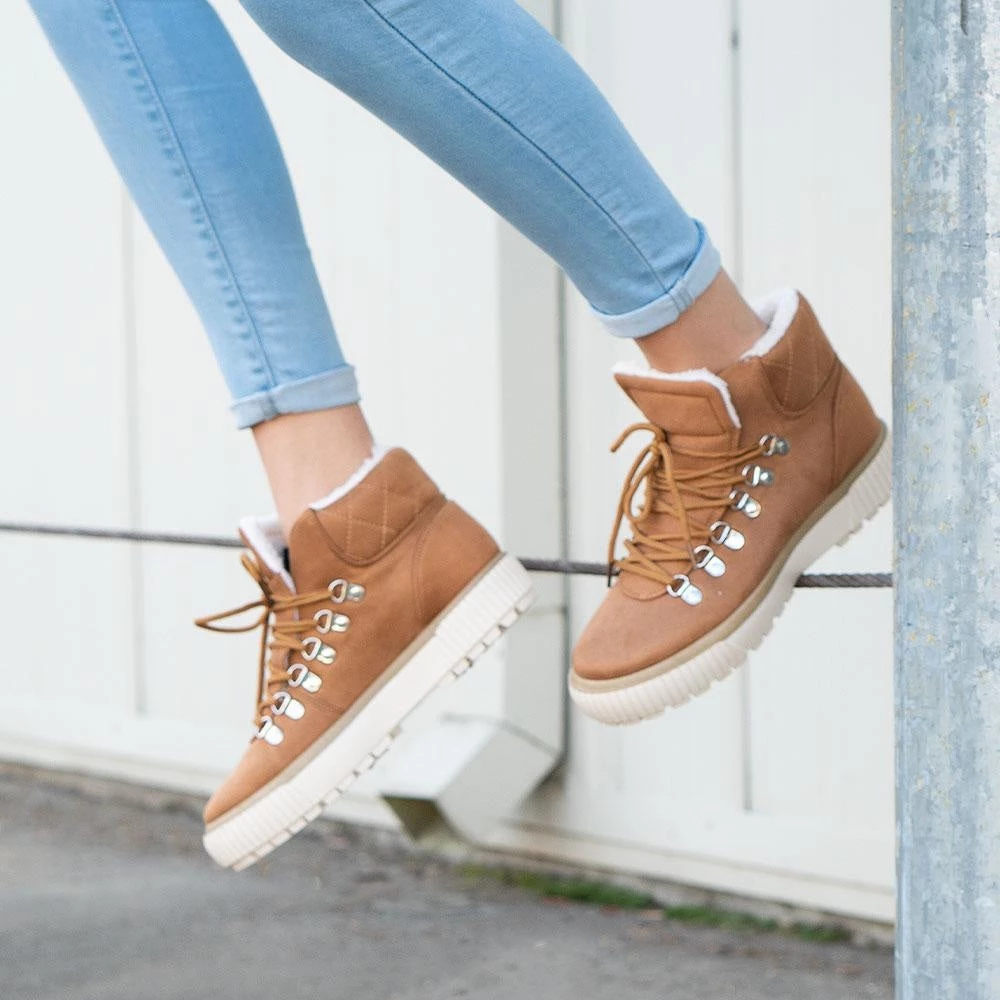 Looking for new kicks? Our Bamboo Online-8 are the perfect pair! These sneakers are crafted with a soft faux-suede material that covers the entire base of the shoe and rises past the ankle in a hightop fashion. A faux-sherpa fur lines the inside and opening of the shoe making it comfortably fitted and perfect for the upcoming seasons. A beige and white chunky sole adds dimension to the shoe while padded insoles create comfort for long lasting wear. Monochrome laces tie up the front of the shoe with silver eyelets decorating either side. Pair these shoes with jeans, beanie and puffy jacket for an easy winter look.