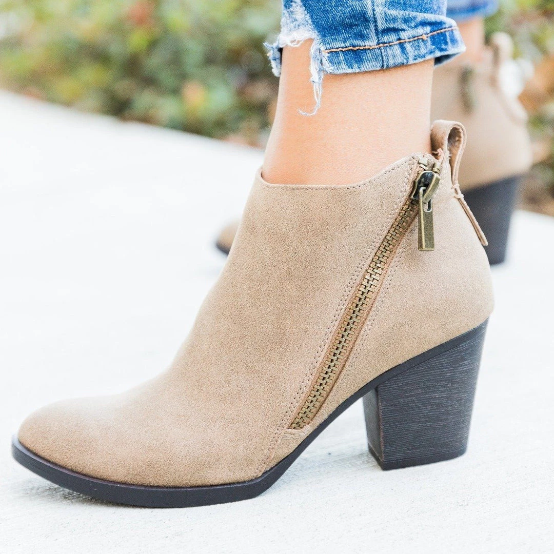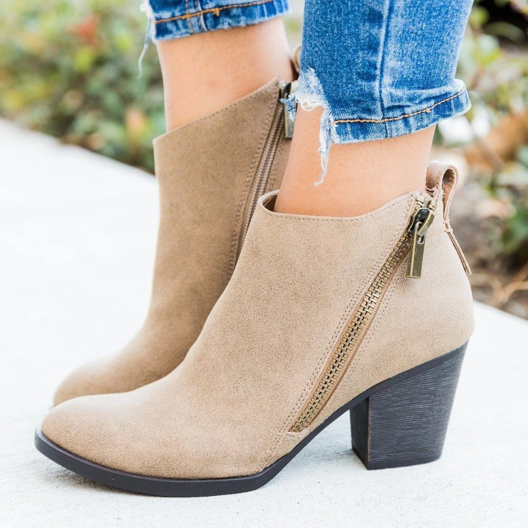 Kick up your heels in the Bamboo Shoes Avenge-01M ankle booties! These chic booties feature an edgy zipper accent on the outside of the shoe, while the interior side of the shoe has a practical zipper, allowing for easy on/off access. These booties have a posh almond-shaped toe and a super trendy 3″ stacked block heel. Available in different colors and textures–black (faux leather), taupe (faux nubuck), and chestnut (faux nubuck)–these shoes will go great with anything in your closet! Wear these booties with a pair of jeans and a sleek faux leather jacket layered over a basic knotted tee for that fashionista-meets-biker-chick look! Made with all man-made/vegan materials.