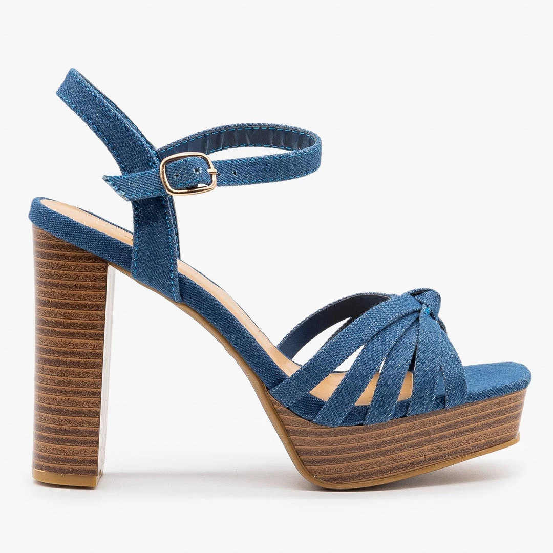 Kick your style up a notch with these traffic-stopping Bamboo Shoes Merge-03 heels! Crafted with faux suede or denim, they feature a 1″ platform on the toe and have an approx. 4.5″ stacked heel to give you some serious style. Five thin straps cross over the toes and are knotted together in the center for a cute cinched look. A slingback and ankle strap provide extra support and the adjustable buckle ensures the perfect fit. Available in black, natural tan and blue denim, these heels are perfect for any look! Style these sandals with a black denim skirt, tucked in earth-toned top, a belt and some jewelry for a gorgeous summery look! Made with all man-made/vegan materials and runs true to size.