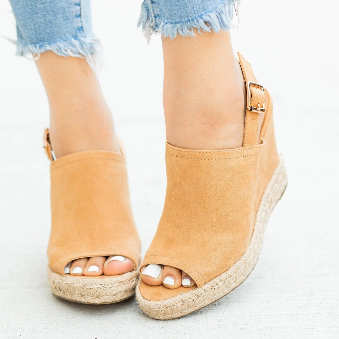 Touch the sky in these beautiful Bamboo Shoes Rina-09 wedges! Crafted out of faux suede, these wedges feature an adjustable ankle slingback strap for practicality, and a lovely peep toe design that gives these shoes an adorable look. The 1″ esparto platform sole is right on trend, while the 3.5″ wedge gives you some extra height and adds sass. Pair these wedges with some high-waisted ankle jeans and an off-the-shoulder top for the perfect brunch outfit! Made with all man-made/vegan materials.
