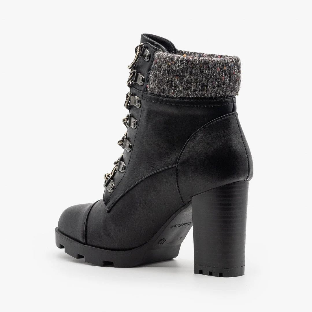 Cold weather doesn’t mean you have to sacrifice style! Look your best all winter long with these chic Bamboo Shoes Pilate-11 booties! Designed with faux leather, these beauties feature a super sassy 4″ stacked heel, a lug sole and rounded toe. These booties rise to just above the ankle and have a cool clasped lace-up design that lets you adjust for the best fit. A sweater-knit cuff gives these booties a lovely cozy finishing touch.