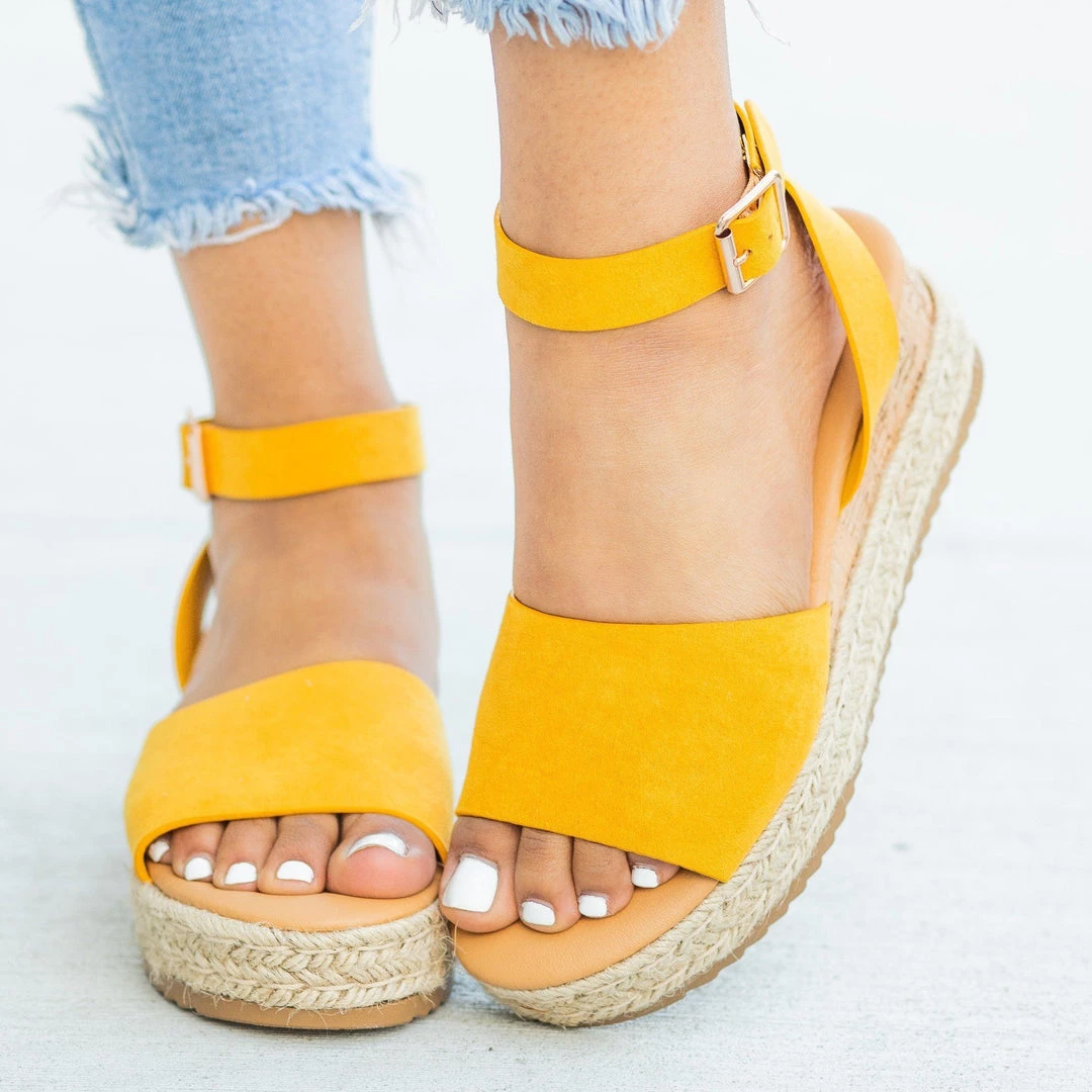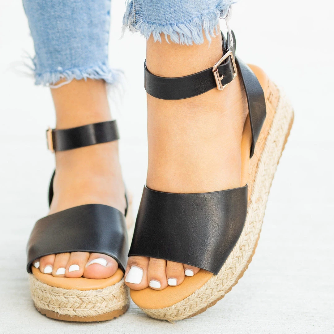 Step into these beautiful Bamboo Shoes Leading-01 flatform wedges to complete all your favorite outfits! Made out of faux leather (black, tan, white) or faux nubuck (marigold, red), these wedges feature an adjustable ankle strap for easy on/off access. The 1″ espadrille flatform wedge is right on trend, while the 1″ cork wedge adds just a bit more height to these lovely sandal wedges. The ridged rubber sole also provides grip and support. You can wear these sandal flatform wedges with everything from jeans to dresses! Made with all man-made/vegan materials.
