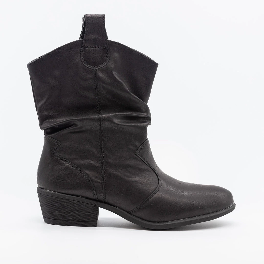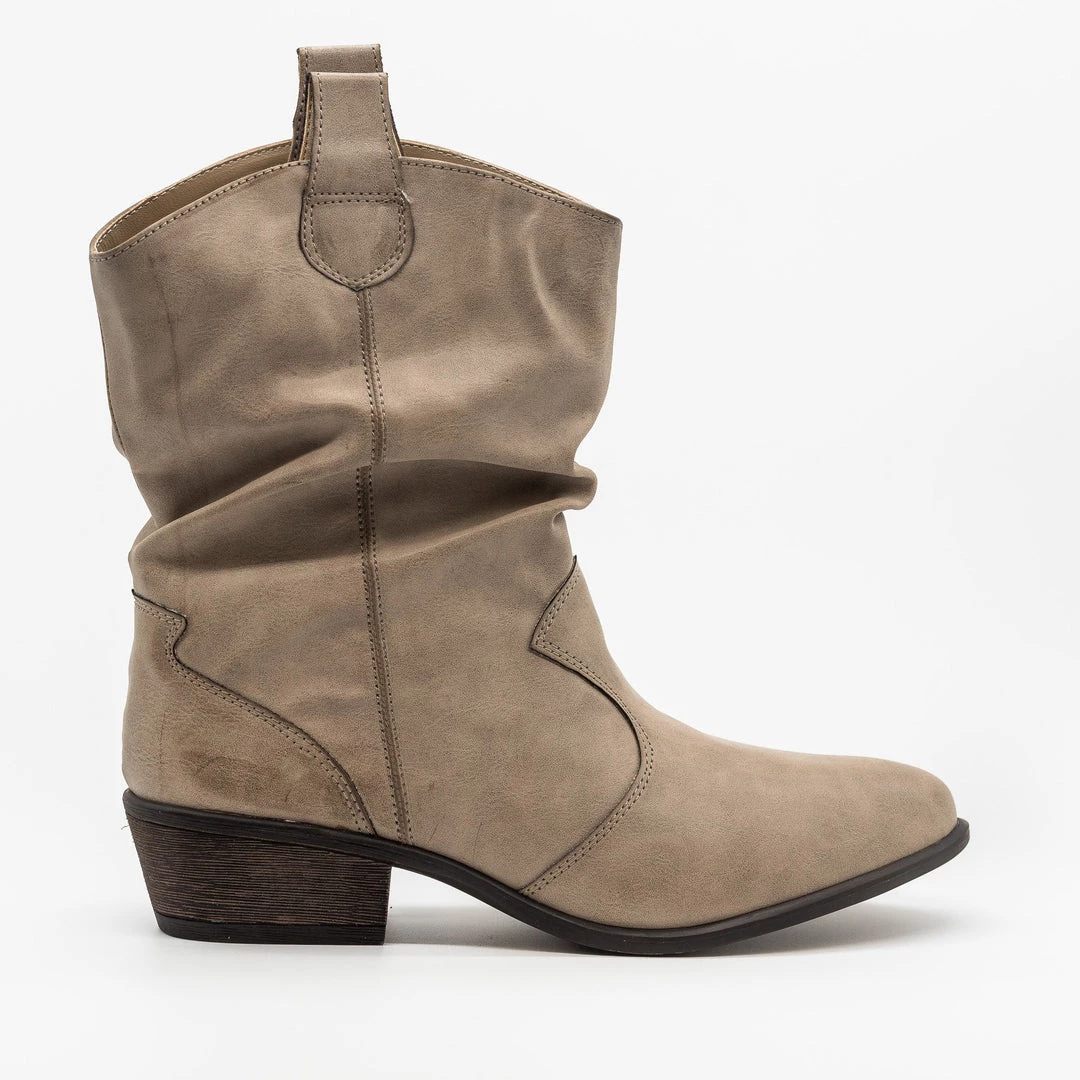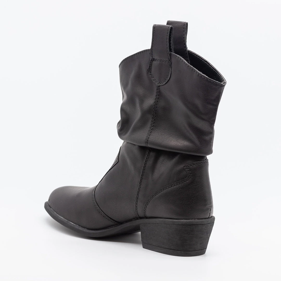 Kick up the dust in these gorgeous Bamboo Shoes Sadie-66S cowboy boots! Crafted out of faux leather, these Western-inspired boots feature an almond-shaped toe for a posh, classy look. The 1.25″ chunky heel adds just a bit of height while the slip-on style makes it super easy to put these shoes on and take them off. Wear these cowboy boots with a floral button-up midi dress and a statement belt for a truly fashionable boho chic look! Made with all man-made/vegan materials.