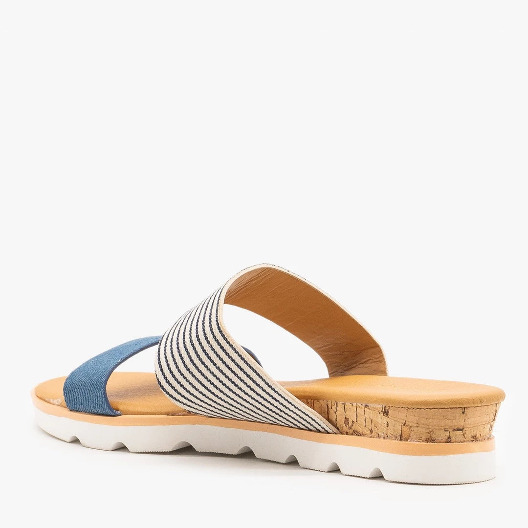 We love these nautical-inspired Bamboo Shoes Hotspot-07 sandals! Designed with faux leather and lightweight knit canvas, these simple sandals feature a ribbed sole, cushioned insole and a low cork wedge heel for just a touch of height. A denim blue strap over the toes and a navy and white striped strap over the foot create a classic open toe style that’s easy to slip on and off in a hurry. For a fresh summertime look, pair these sandals with white skinny jeans, an off-the-shoulder top and a denim jacket! Made with all man-made/vegan materials and runs true to size.