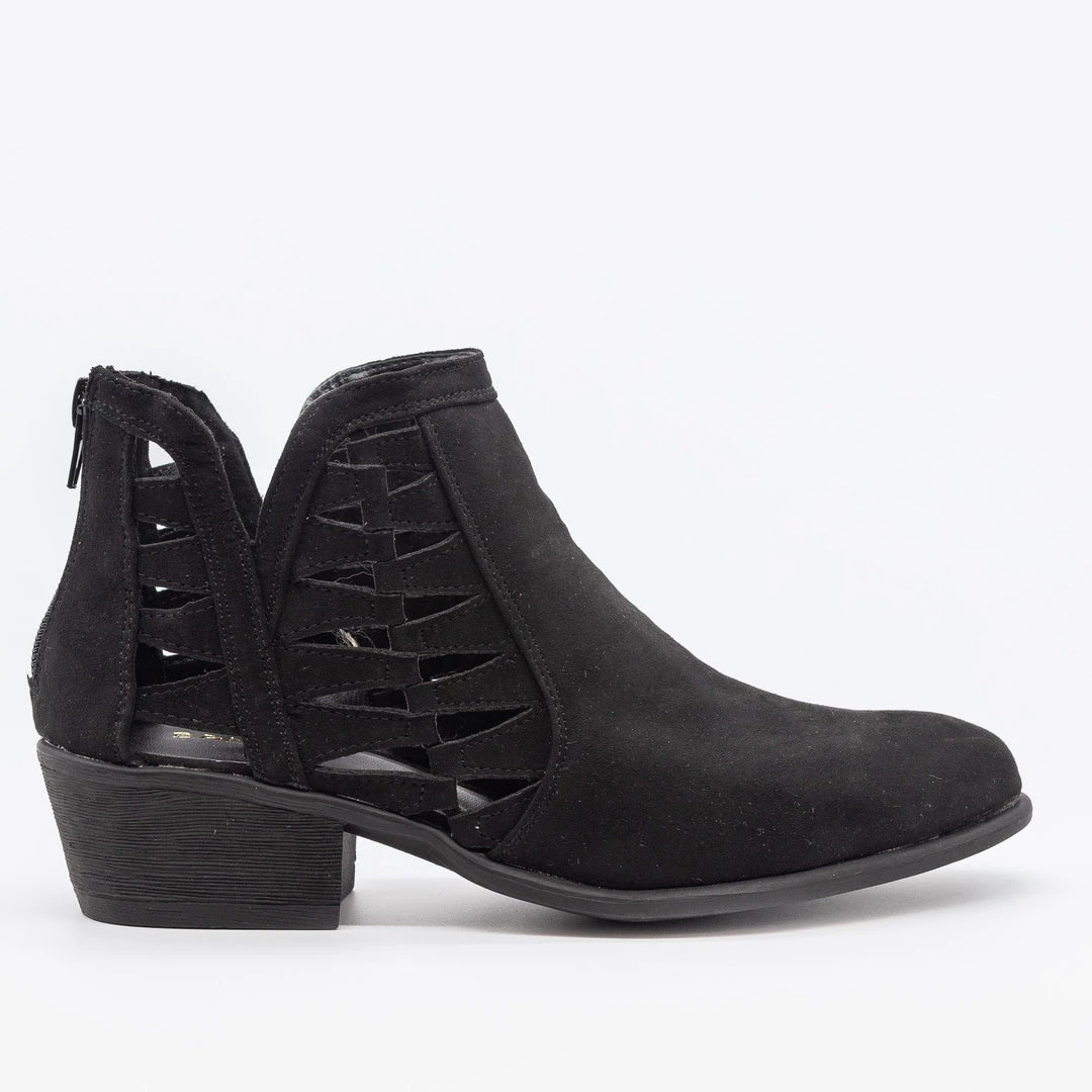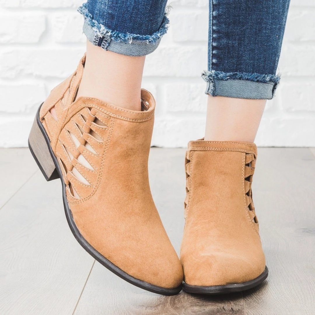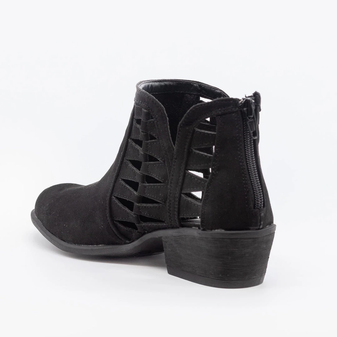 Transition into fall with these darling ankle booties! The Sadie-35S features an almond toe, triangle cut pattern along the sides, and a small block heel. The faux suede gives a soft, autumn look and these are completed with an back zipper. These booties are perfect for completing every day fall/winter outfits! Made with all manmade/vegan materials and runs true to size.
