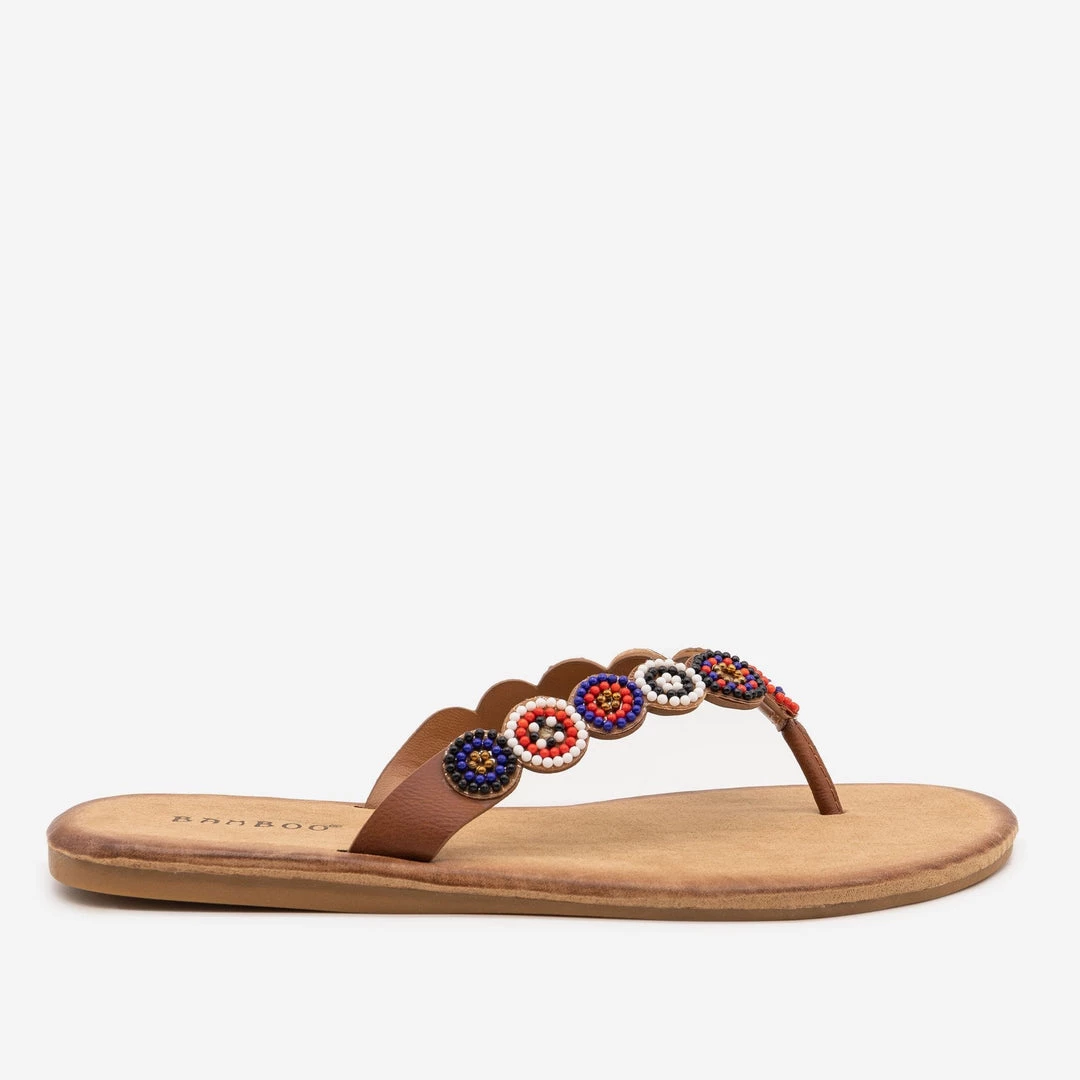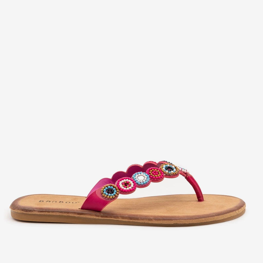 Look no further for the perfect vintage beaded sandal with our Bamboo Made-01 sandals! These beautiful sandals are crafted with a canvas material in a classic thong sandal shape that everyone loves! Unique multi-colored bead detailing along the straps of the sandal give it a very vintage feel for your everyday boho chic look! Available in black, tan, brown and fuchsia you’re sure to have statement piece for every summer fit. Pair these sandals with a long white flow-y skirt and matching wrap around top for an easy boho look! This shoe is man-made with all vegan materials. Take your perfect size as this shoe runs true to size!Â