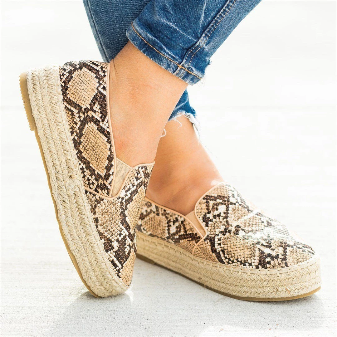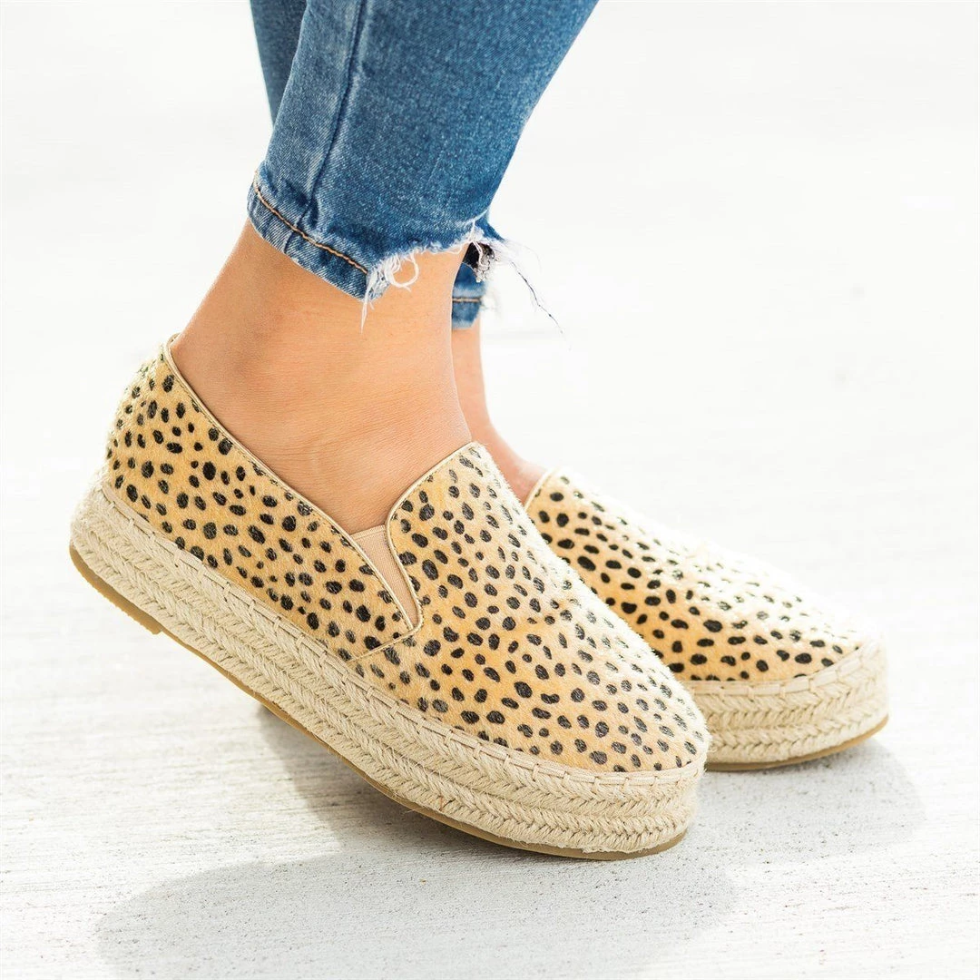 Take a walk on the wild side with these Bella Marie Shoes Melanie-50 flatform slip-on sneakers! Beautifully crafted out of faux leather (python) or faux pony hair (cheetah), these sneakers feature a trendy 1″ espadrille flatform for style and just a bit of height. The slip-on design also makes these shoes super easy to put on and take off. These sneakers are great to wear with a pair of distressed raw hem ankle jeans and an off-the-shoulder bodysuit for a cute summertime look! Made with all man-made/vegan materials.