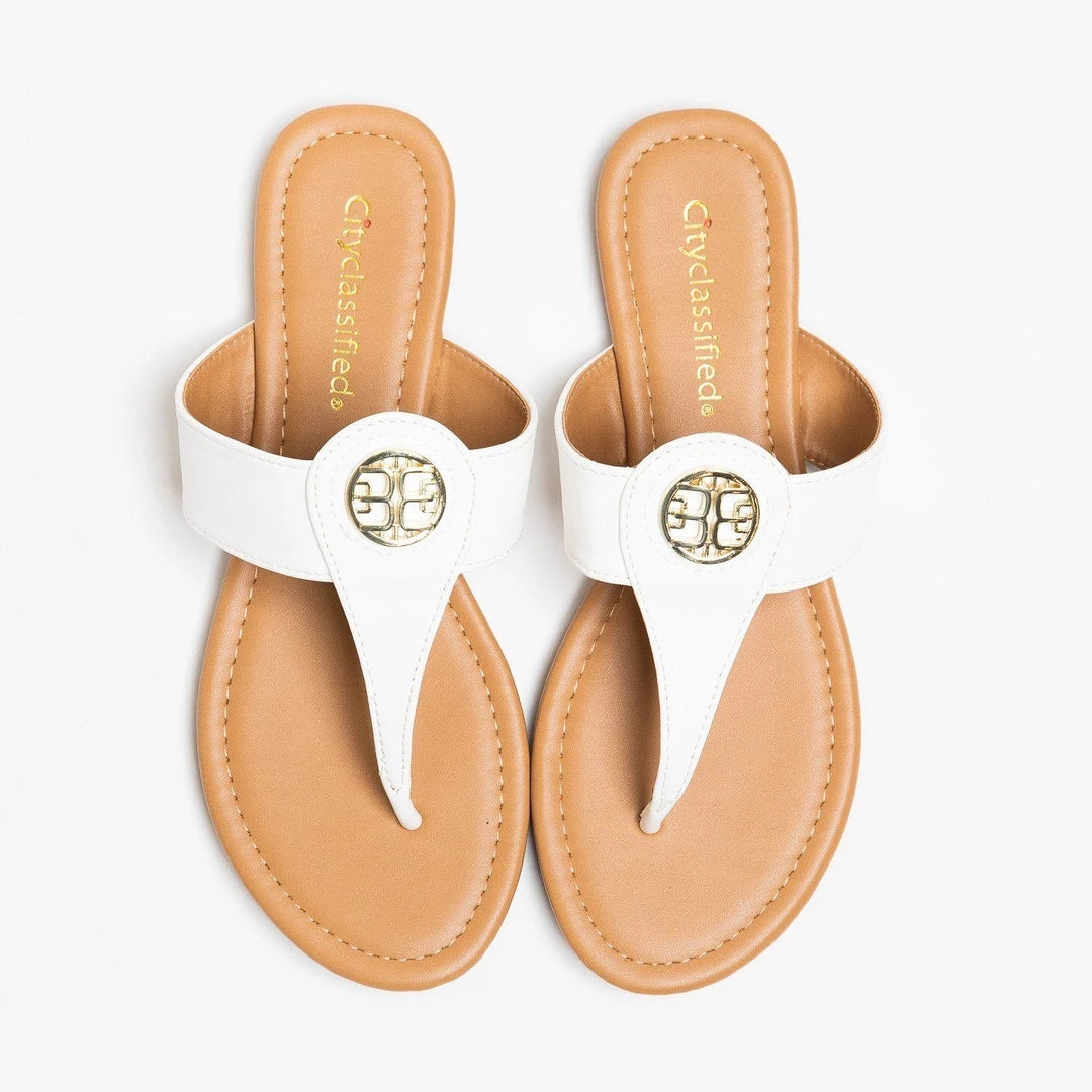 Walk the runway in these City Classified Shoes Quota-S sandals! Beautifully crafted out of faux leather, these sandals feature a thong-toed slip-on style for easy on/off access and a designer-inspired design for an extra classy and posh look. Available in several different colors, these sandals will go great with everything from jeans to shorts to dresses–you can’t go wrong with these super cute sandals! Made with all man-made/vegan materials.