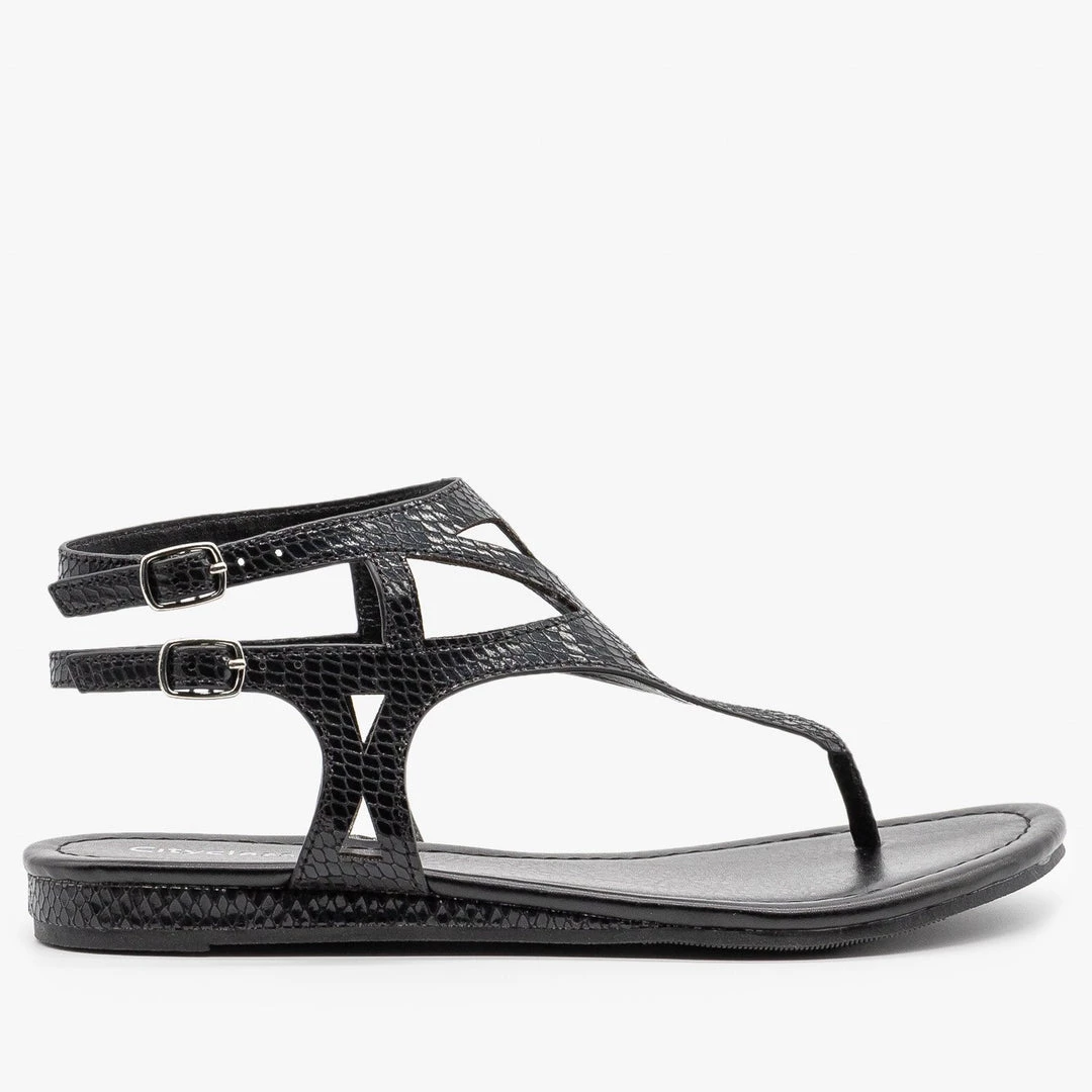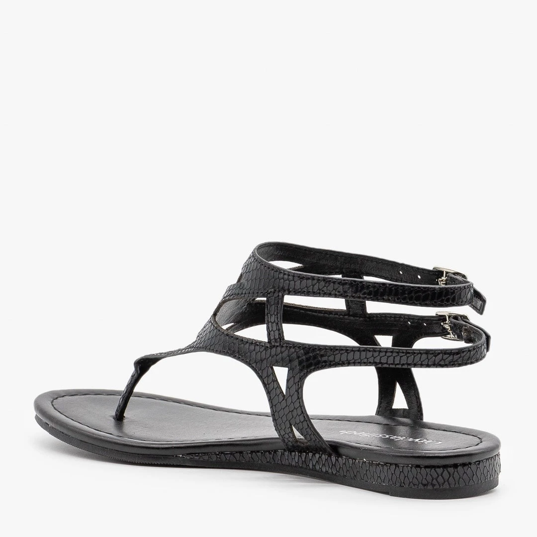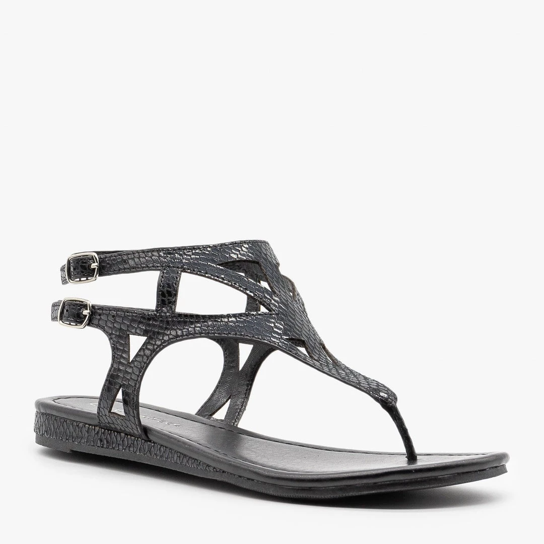 Put a flashy finishing touch on your look with these snake print City Classified Shoes Maxine-S sandals! Crafted with faux leather, these cute sandals feature a .5″ heel, a thong toe design and back ankle straps with buckles that adjust for the perfect fit. The body features triangle cutouts and is entirely covered in shimmery snake scale print in either black or gold, giving these sandals some serious edge. Pair them with black skinny jeans and a cropped graphic tee for a sassy everyday look! Made with all man-made/vegan materials and runs true to size.