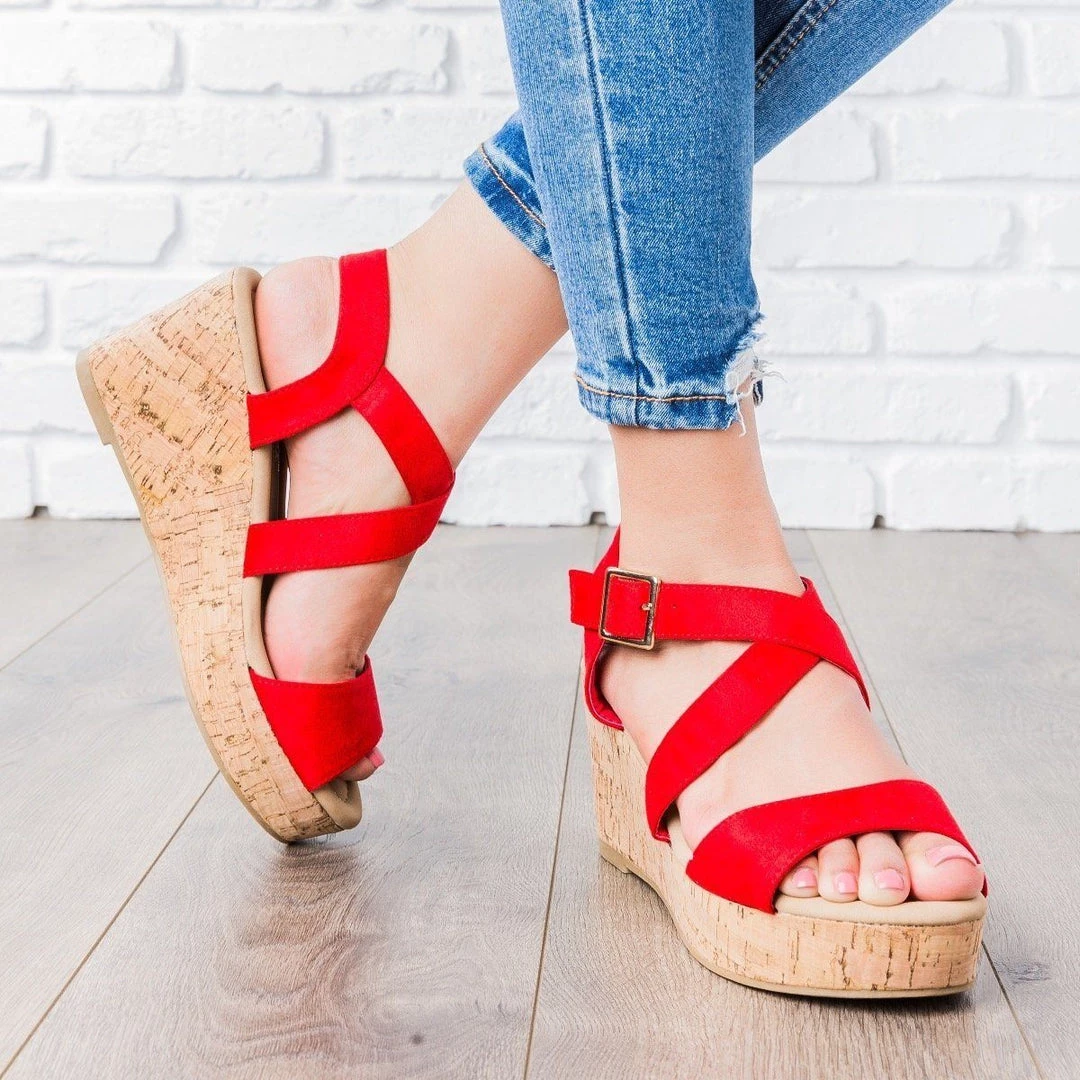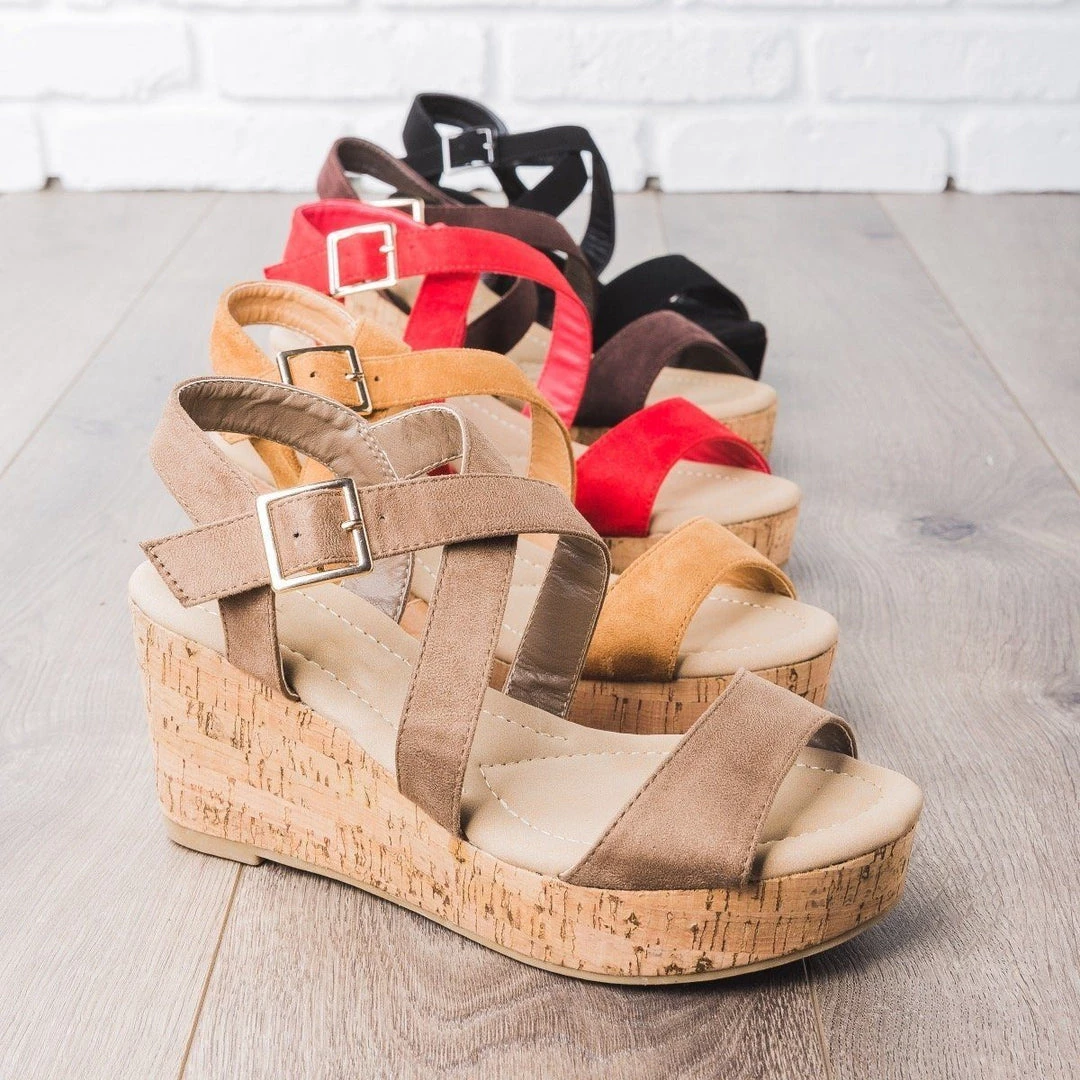 The DBDK Lyssa-2 is a beautiful platform wedge with cork detailing and a comfy insole. The straps form a cross in front of the foot and then fasten into a darling buckle at the ankle. These open toe shoes also feature a slightly curved toe strap. Pair these beauties with a summer skirt or tailored shorts for a classy cute look. Made with all manmade/vegan materials and runs true to size.