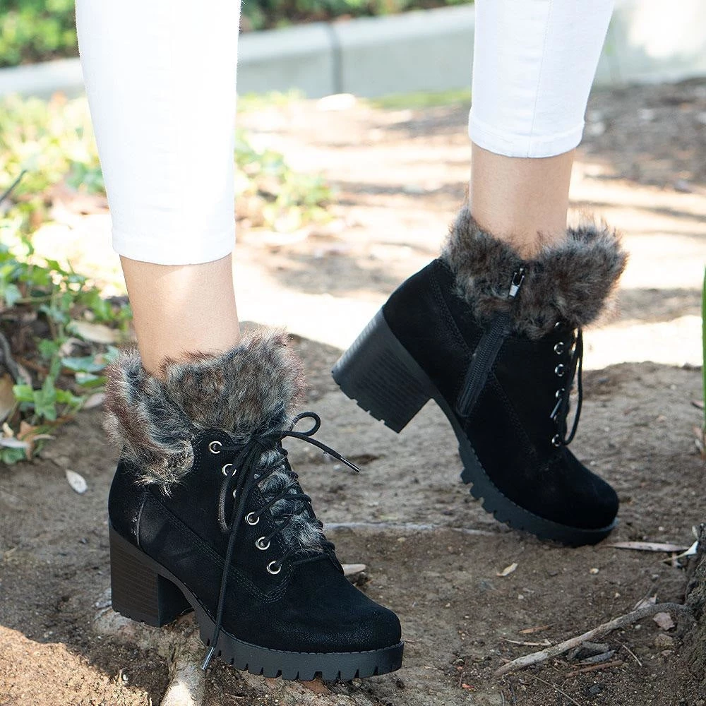 Start your season off right with our Delicious Shake-S booties. These gorgeous booties are crafted with a faux-leather material and rises passed the ankle. A cute faux-fur trim lines the opening of the shoe giving it the perfect cozy look for the cold weather. Laces cross up the front of the shoe and paired with lightly padded insoles allows for a perfect and comfortable fit. A small chunky heel adds height and dimension to this shoe with a rigid bottom sole making them easy to walk in all day long. Pair these gorgeous booties with black leggings and a winter coat for a cute cold weathered outfit!