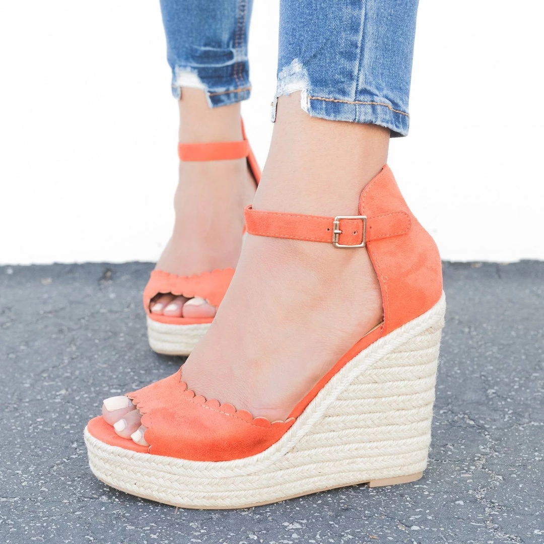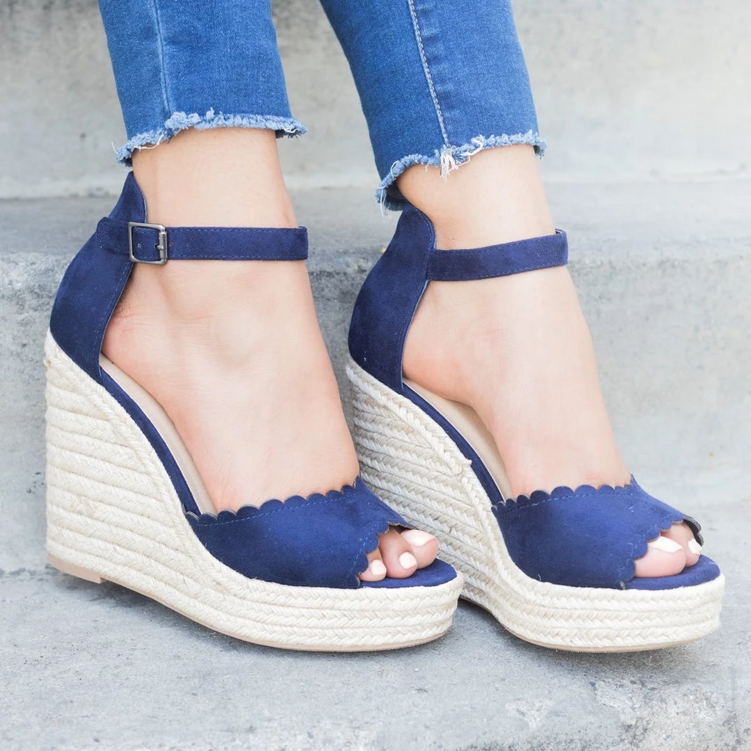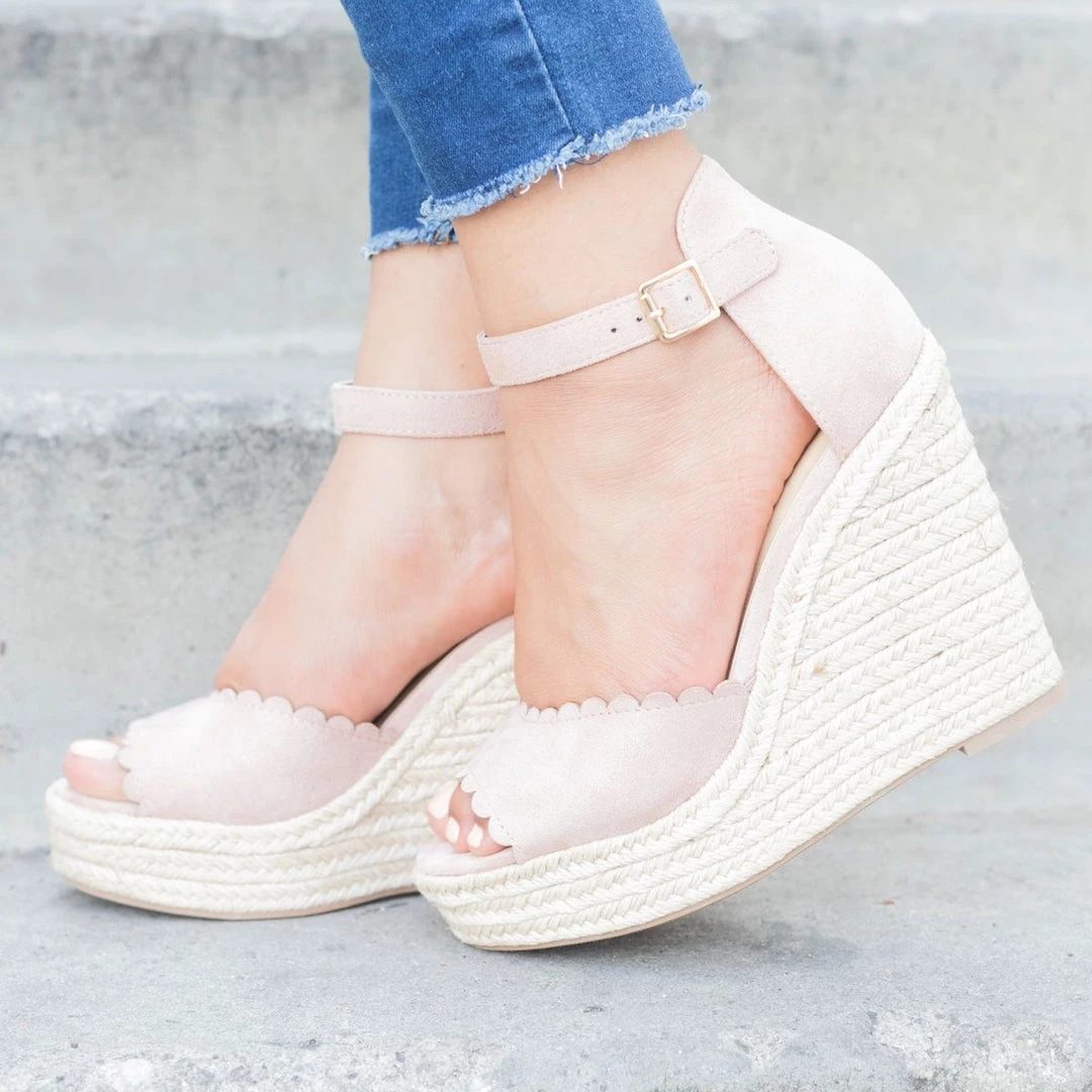 These chic scalloped espadrille wedges are Summertime fine! Crafted with soft faux suede material and features a gorgeous scalloped style that is sure to make your summer outfits! They approx. a 4.75″ espadrille wedge with cushioned insoles, a peep toe, and adjustable ankle straps. We are loving this style complimented in a wrap dress. Made with all man-made/vegan material and runs true to size.
