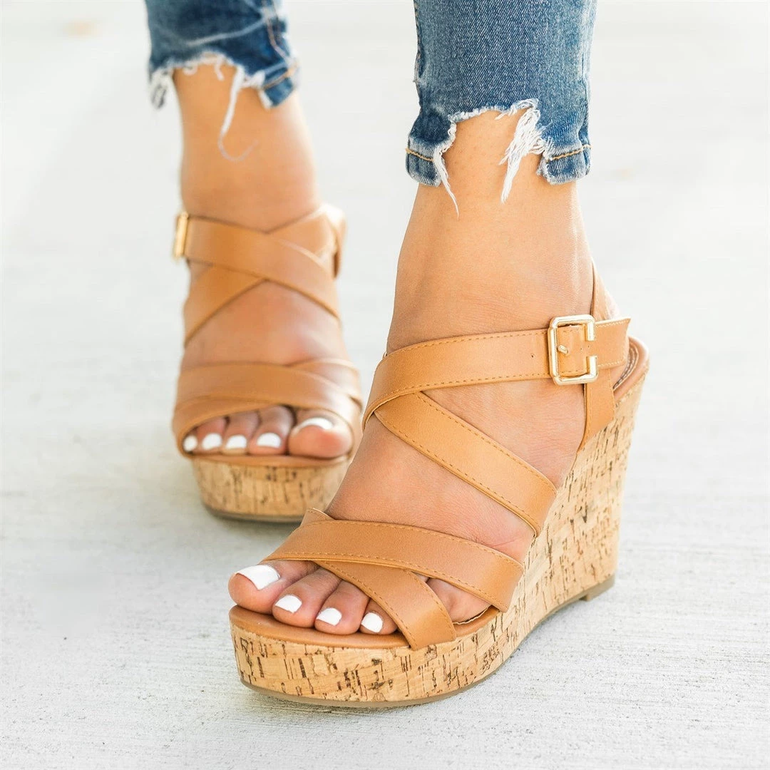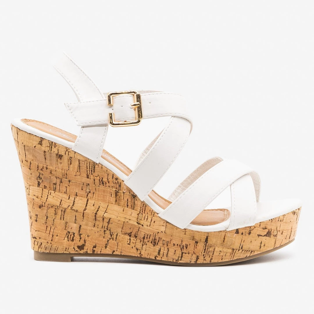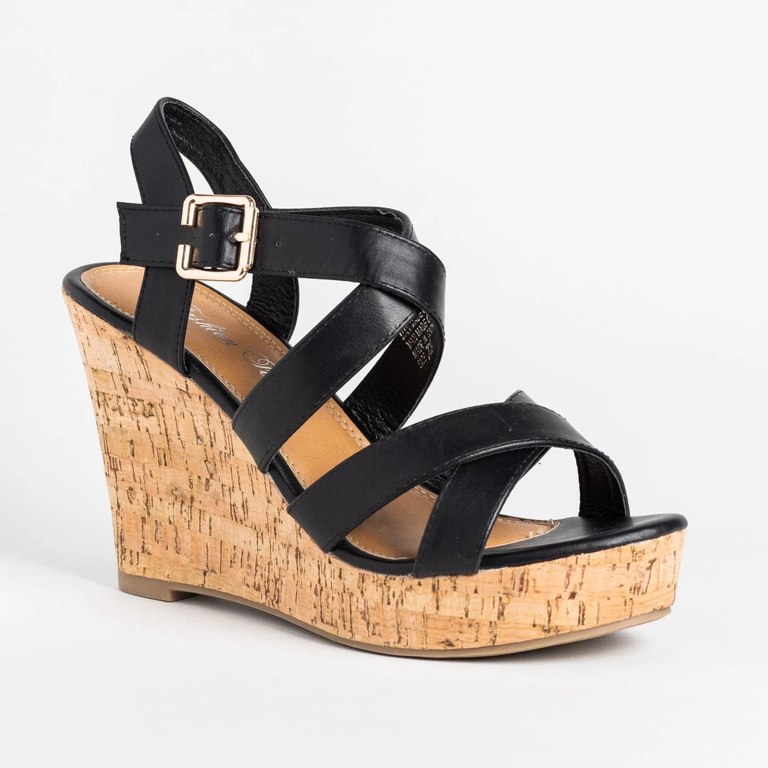 Put your best foot forward in these Fashion Focus Shoes Super-32 cork wedges! These beautiful wedges are made out of faux leather and feature an adjustable ankle strap for easy on/off access. The 4″ cork wedge adds just the right amount of height while the criss crossing strap design gives these shoes some style. You can wear these wedges with a ruffled off-the-shoulder floral dress and some dainty accessories for the perfect summer outfit! Made with all man-made/vegan materials.