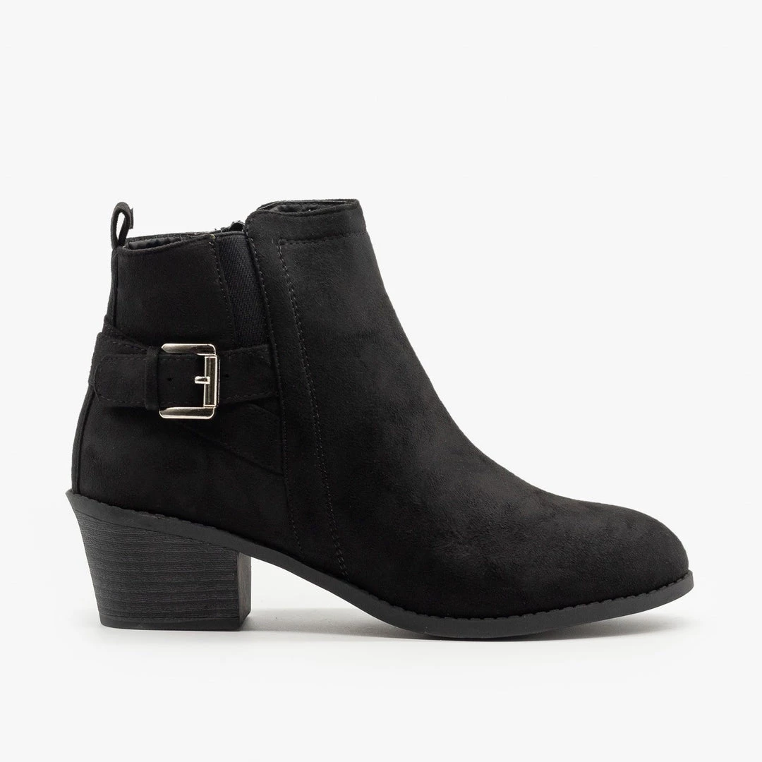 Buckle up for hot cocoa and scarf weather with these adorable Forever Shoes Eury-9 booties! Crafted from faux suede, these booties feature an approx. 2″ stacked block heel and an almond shaped toe. Two bands cross around the back of the ankle and are finished with a decorative buckle on the side. An inner zipper lets you slip these booties on and off with ease. The faux suede gives a soft, autumn feel and the simplicity of the booties makes them easy to pair with many different outfits. For an easy go-to fall look, wear these booties with distressed, dark wash high waisted skinny jeans, a cropped mustard-colored sweater and a drop necklace! Made with all man-made/vegan materials and runs true to size.