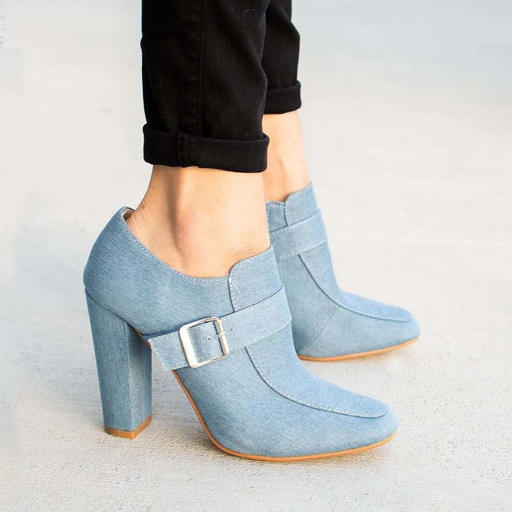 These Forever Forest-49 shoes pair best with all your pencil skirts and business casual attire! They are crafted from a canvas material that gives off a denim look and have a low ankle opening, soft pointed toe, buckle design and a heel thick enough to walk comfortably in. They have an inner zipper that allows for easy wear. pair with a black pencil skirt, white button up and a blazer of your choice.Â