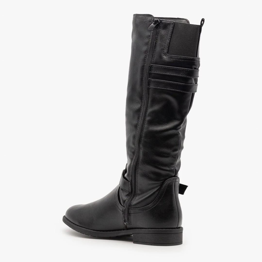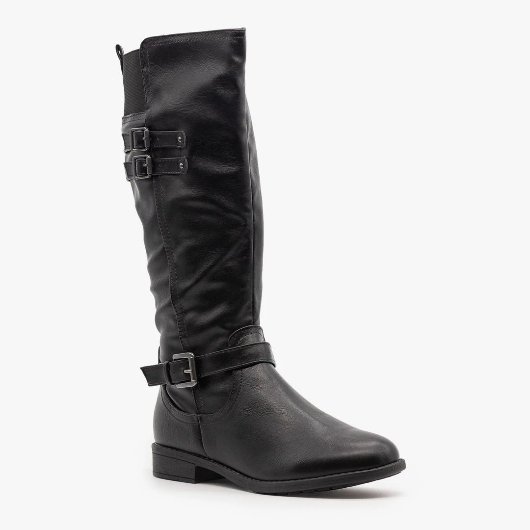 Step into your new favorite everyday boots with the Forever Shoes Elva-22 riding boots! These fabulous boots are designed with faux leather and feature a low block heel, an posh almond shaped toe and a slightly slouchy body that rises to the mid calf. The back of the boot has an wide elastic panel at the top for added flexibility and a full-length inner zipper lets you slip these boots on and off with ease. Two buckles under the elastic panel and one over the ankle of the boot add the perfect finishing touch. Pair these boots with skinny jeans and a bell sleeve sweater for a cozy fall day look! Made with all man-made/vegan materials and runs true to size.