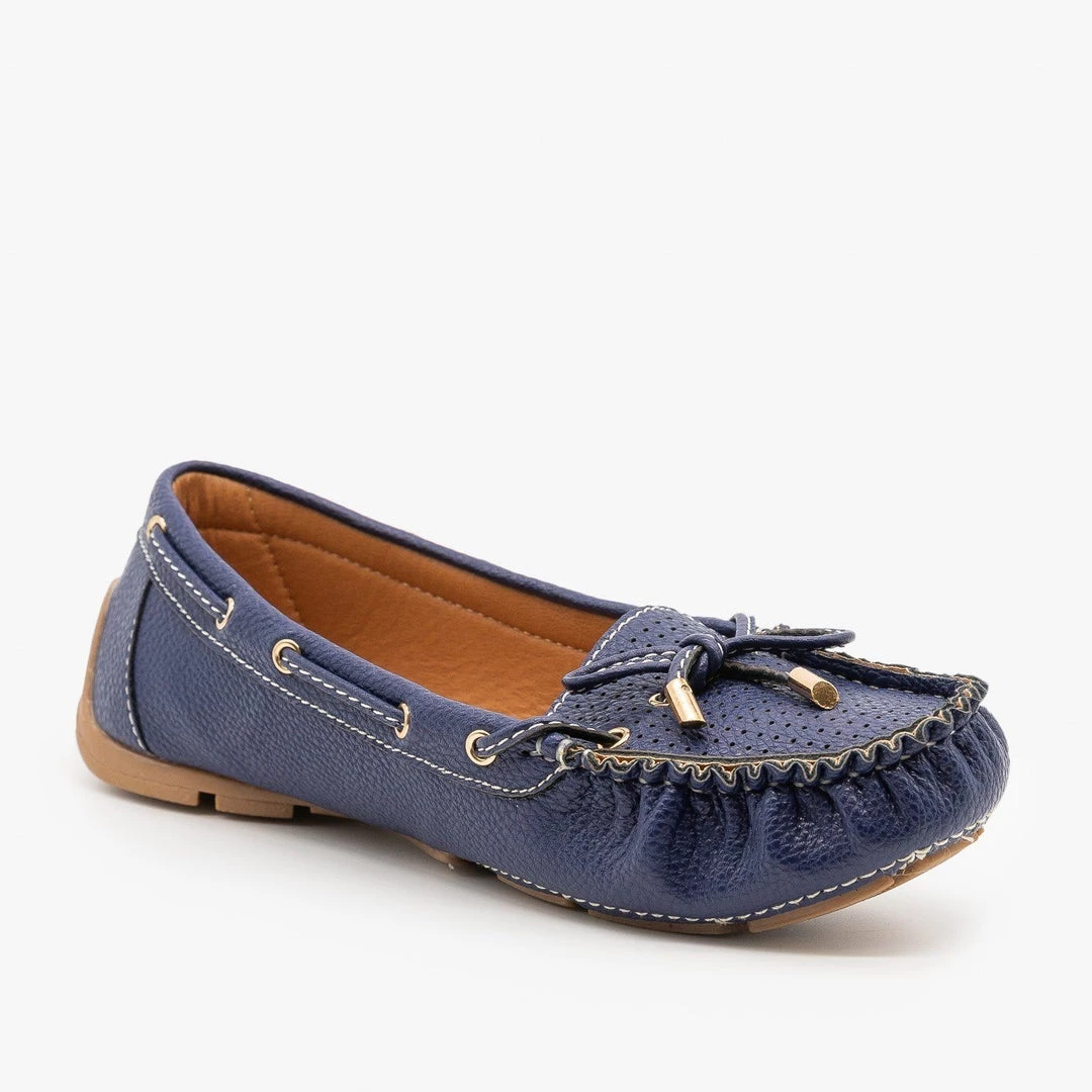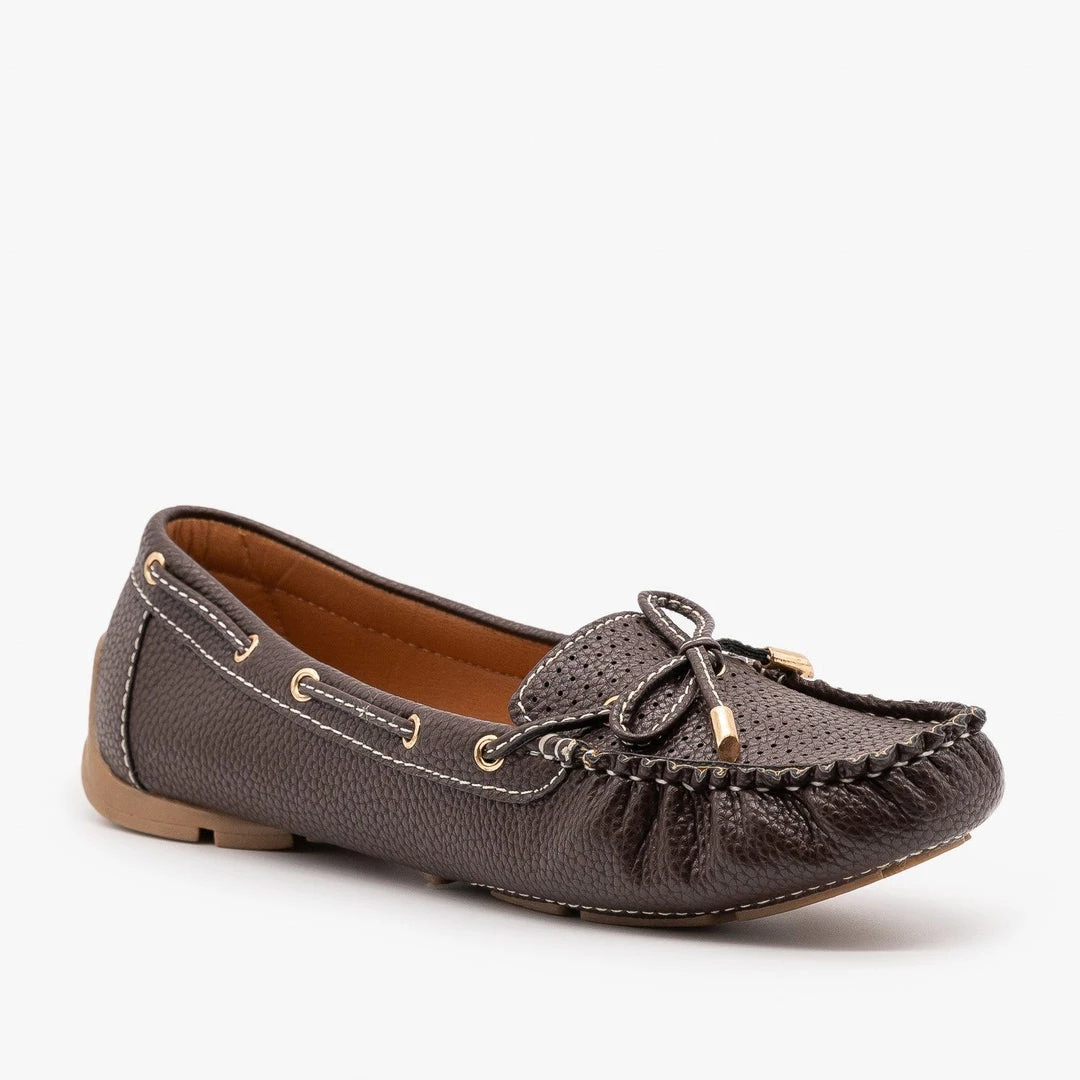 Stay cute and comfy in these moccasin style Forever Shoes Jimmi-06 flats! Crafted with faux leather, these flats feature a sturdy rubber sole, a nicely-padded insole and a cute rounded toe. They also feature wide stitching along the outside in traditional moccasin style. The string is tied in a cute bow on top and finished with metallic ends. The slip on style makes these flats easy to grab on your way out the door. Try pairing them with cuffed boyfriend jeans and a cozy sweater for an easy everyday outfit! Made with all man-made/vegan materials and runs true to size.Â