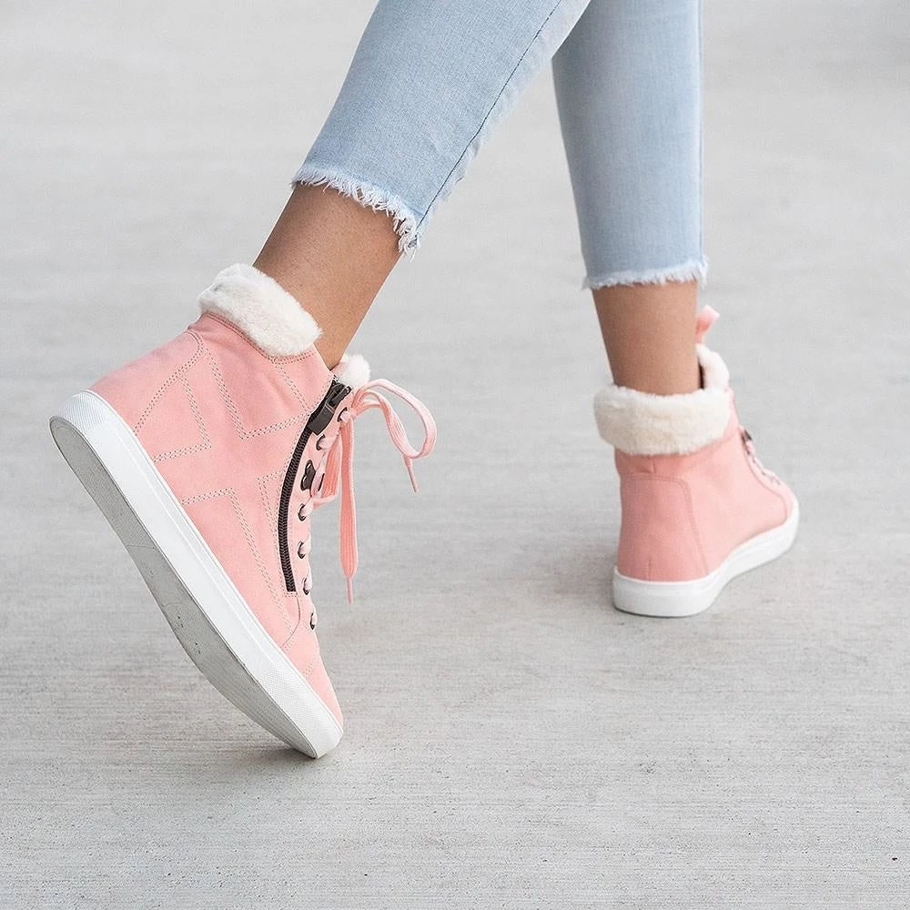 Stay super stylish through out the seasons in our Forever Comment-27 hightop sneakers! They are crafted from a faux-leather material and feature lace-up detailing, a decorative outer zipper, cushioned insoles and a cute faux-fur trimmed opening. They have a classic white sole and rounded toe that give off the sneaker feels. Pair with jeans and a hoody and keep it cute, casual and always comfy!