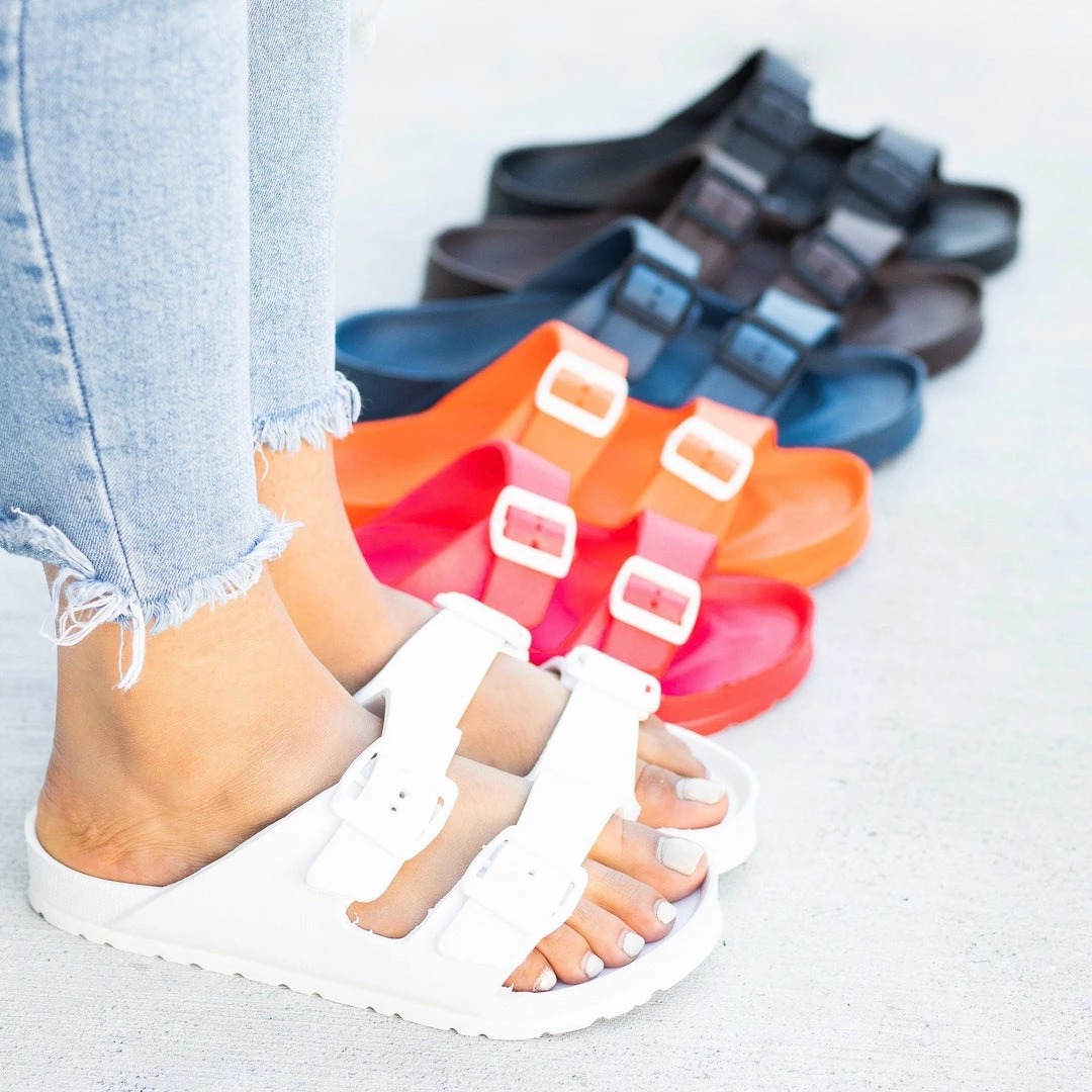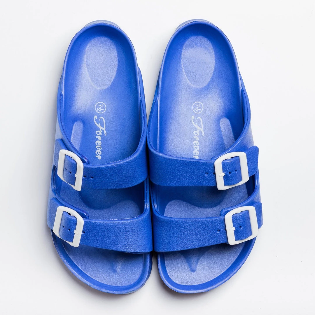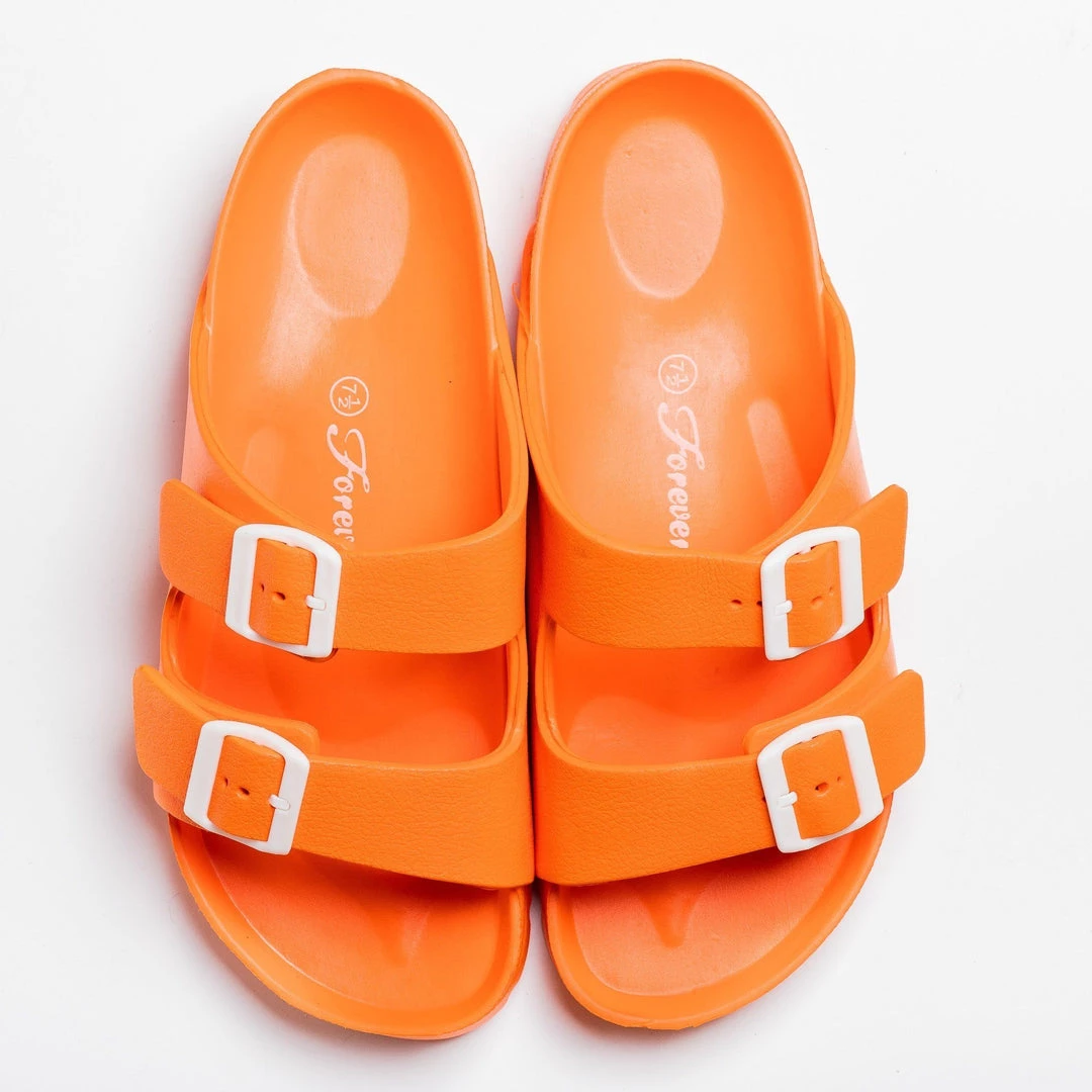 Turn heads with the Forever Shoes Beva-02 slides! These trendy slides are made out of foam style material and feature a slip-on design for easy on/off access. The double buckled strap detail also gives these shoes some extra style and edge. Available in a variety of beautiful colors, you can wear these shoes with just about anything–from jeans and leggings, to shorts and sundresses, you can’t go wrong with these lovely slides! Made of all man-made/vegan materials.