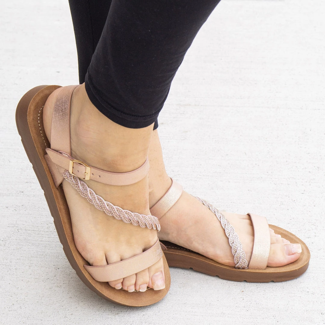 Get the perfect glamorous twist on your everyday sandal with our Forever Reform-79 sandals! They feature a three strap design- one across the front of the foot, the ankle and a diagonal braided accent strap that is encrusted with rhinestones. The accent strap allows for these sandals to be dressed up or down with a white tennis skirt and halter top or mom jeans and a cropped T. Super cute, comfortable and perfect for summer, you’ll want them in every color!Â