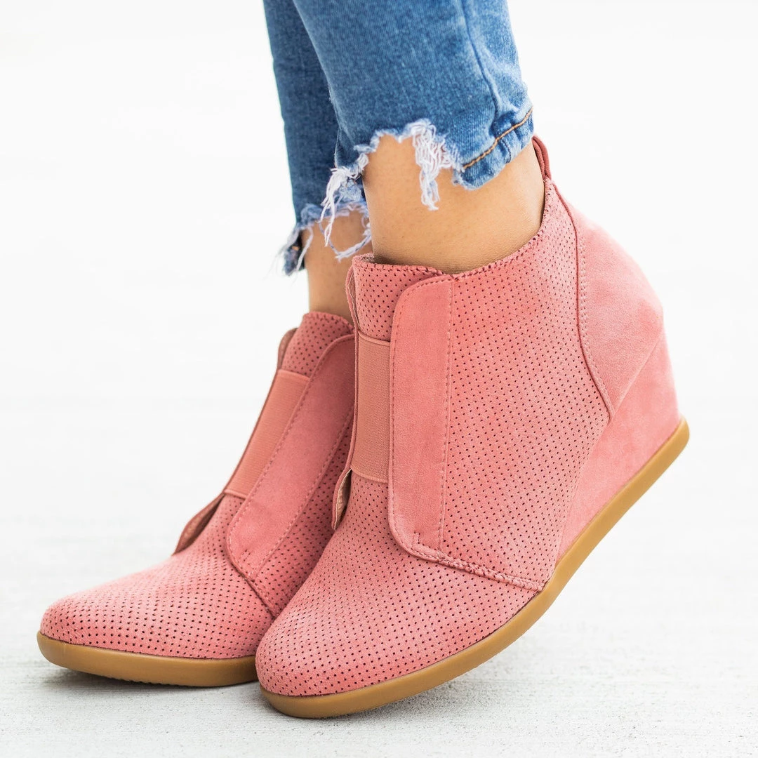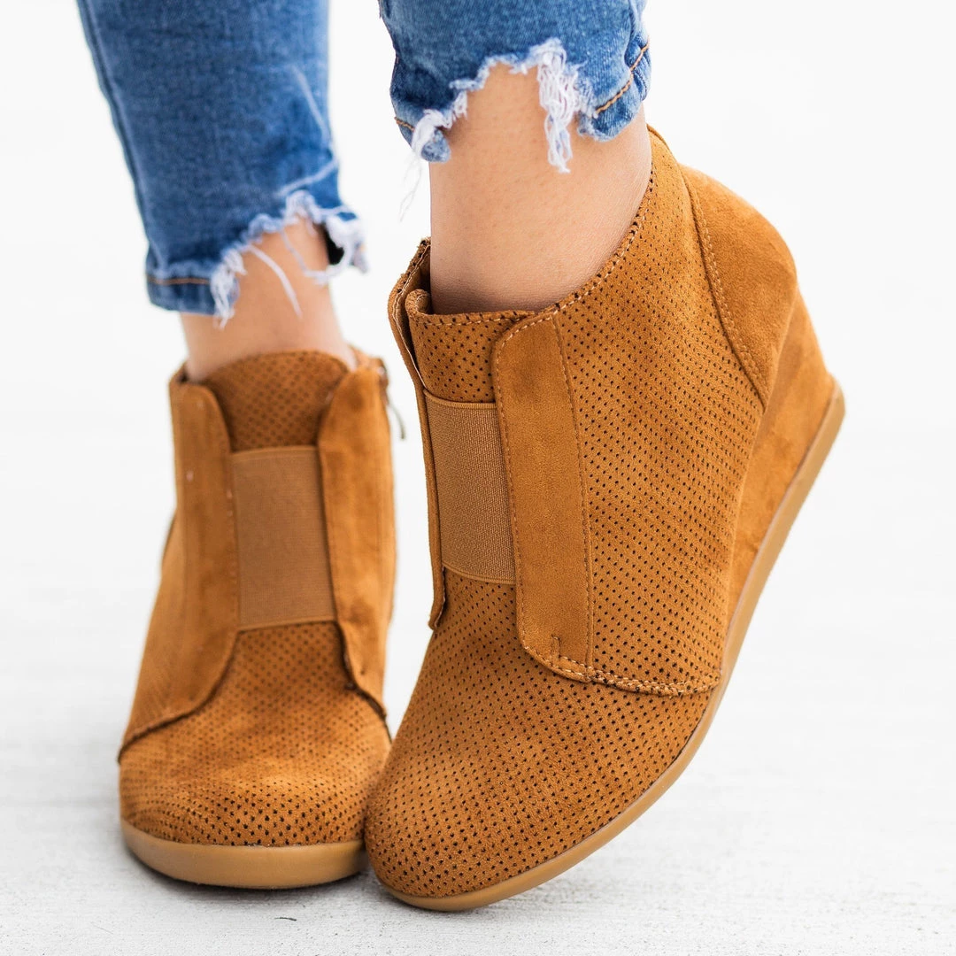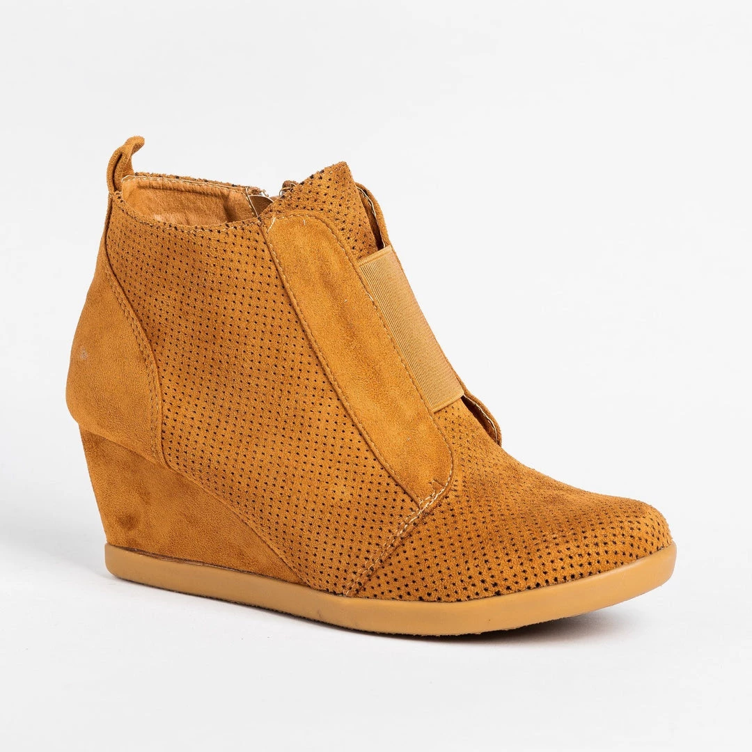 Step out in style with these Forever Shoes Peggy-46 bootie wedges! Made out of faux suede, these wedges feature a trendy pinhole design and a sporty wedge style. The 3″ wedge heel gives these shoes some extra height, while the interior side zipper provides easy on/off access. Slip on these wedges and wear them with some high-waisted dark wash jeans and a chunky sweater for a super cute cold weather look! You can even pair these shoes with some distressed denim shorts and a basic tee for a cute and laid-back summer outfit! Made with all man-made/vegan materials.