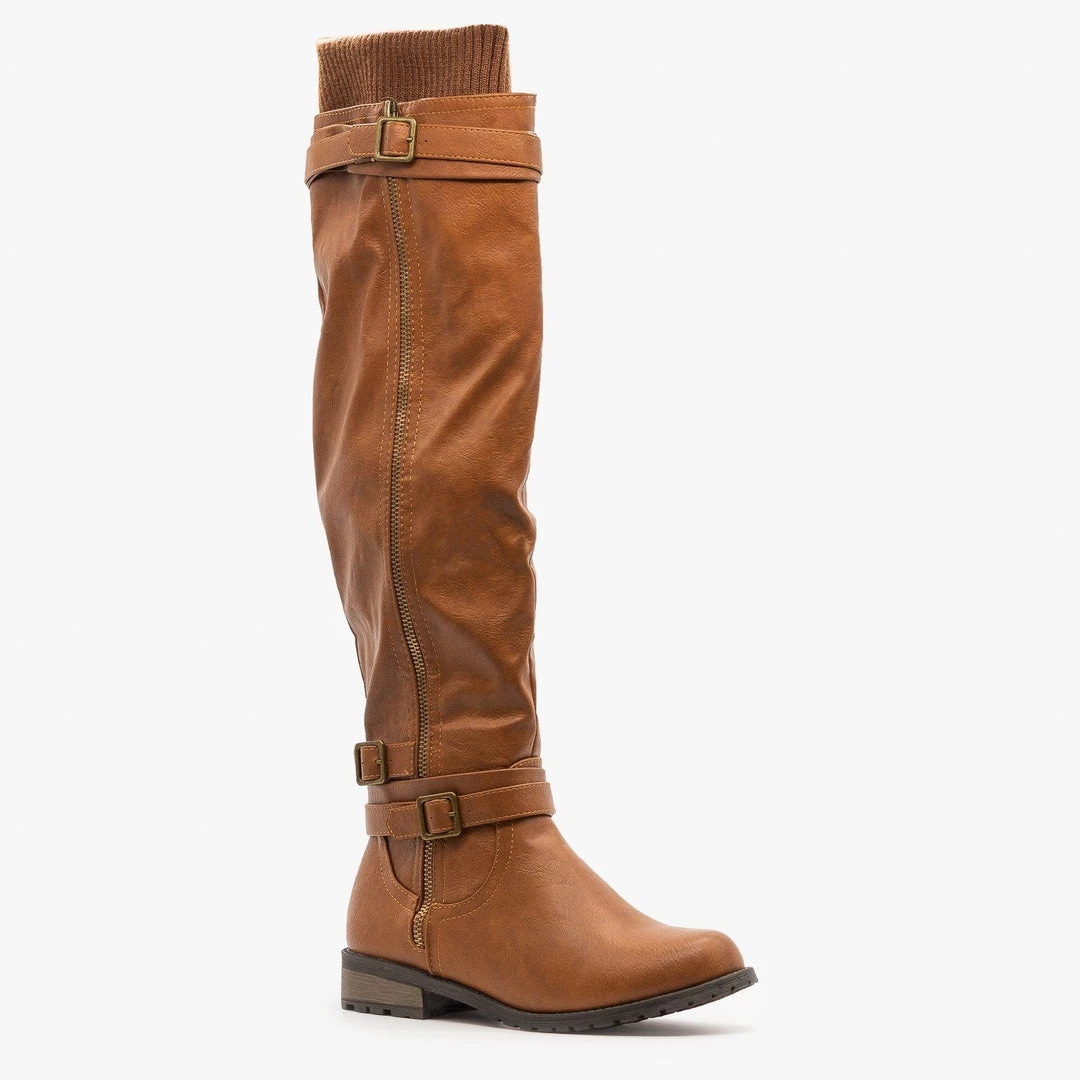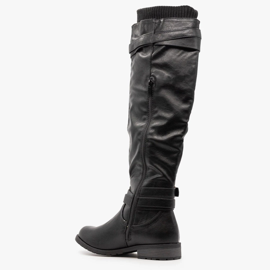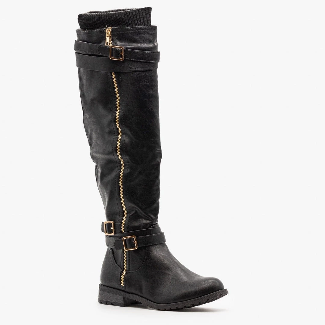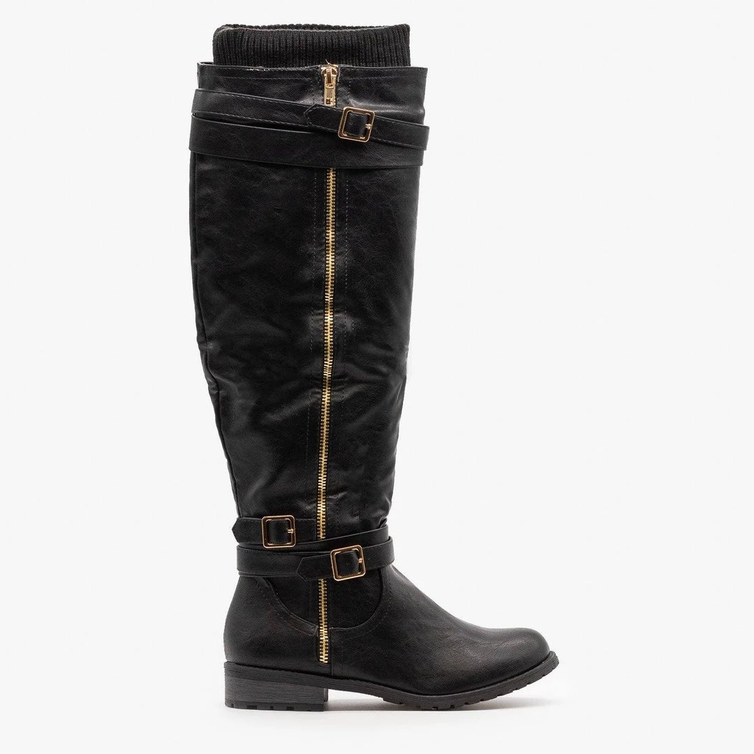 Step into your new favorite everyday boots with these Forever Shoes Mango-L45 riding boots! Designed with faux leather, these boots feature a 1″ block heel, rubber tread and a classic rounded toe. The body of the boot rises all the way to the knee and has a sweater knit cuff that makes these boots look super cozy. A double belt around the top of the boot and another double belt buckled around the ankle add a little detail and a decorative outer zipper makes a perfect finishing touch. A half-length inner zipper makes putting these boots on and taking them off super easy. Pair them with dark skinny jeans and a cozy sweater for a warm winter look! Made with all man-made/vegan materials and runs true to size.