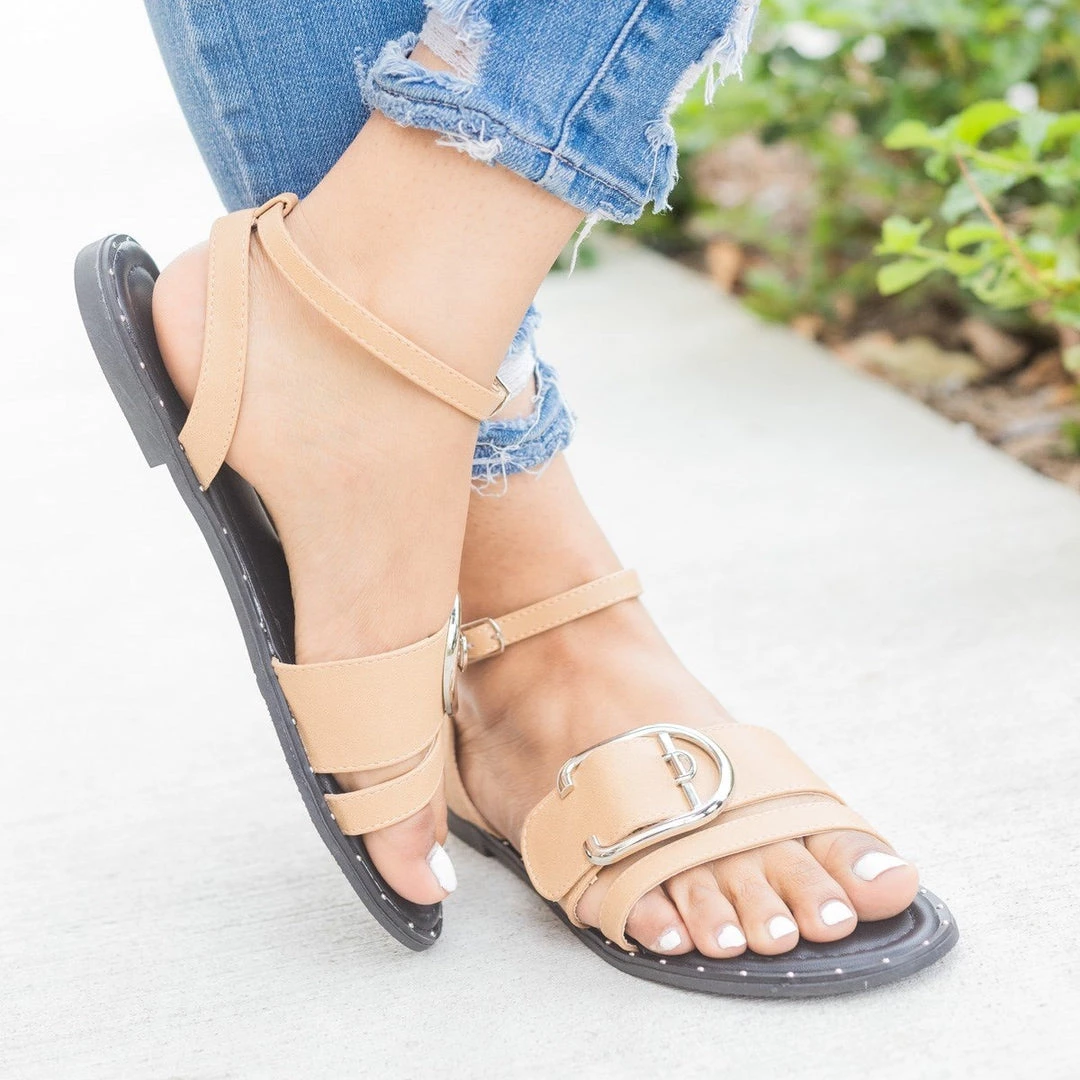 Super cute and very unique our Forever Cross-05 sandals are the perfect pair to dress up or down! They are crafted from a faux-leather material and feature a triple strap design with a large buckle detailing. The ankle strap has a functioning buckle for easy wear and are open-toe perfect for the warmer days! Pair with ripped light denim jeans and a white off the shoulder top for a cute and girly lookÂ