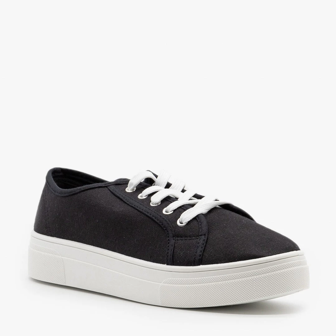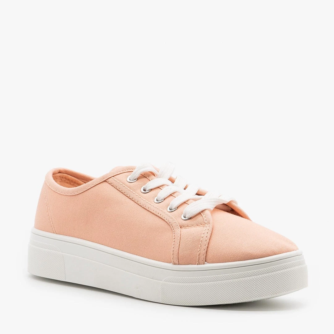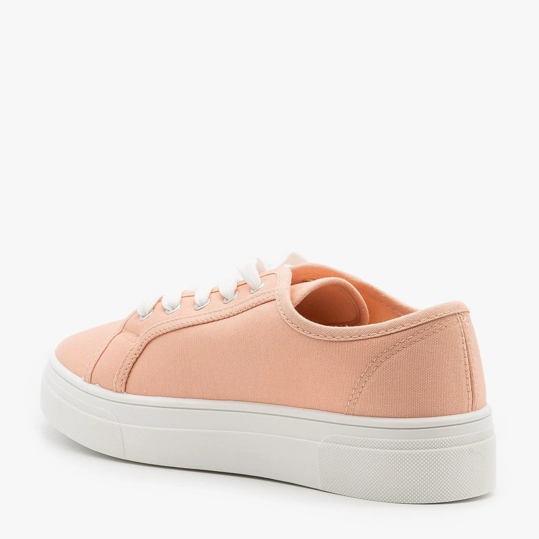 These La Sheelah Shoes Dolce-20 sneakers are the perfect classic sneaker for all your spring looks! Designed with a lightweight canvas material, these sneakers feature an approx. 1″ platform with white foxing, a classic rounded toe and lace up style. The body is super simple in either pastel pink or a snappy black. Pair these sneakers with distressed mom jeans and a comfy cropped tee for an easy everyday look! Made with all man-made/vegan materials and runs true to size.