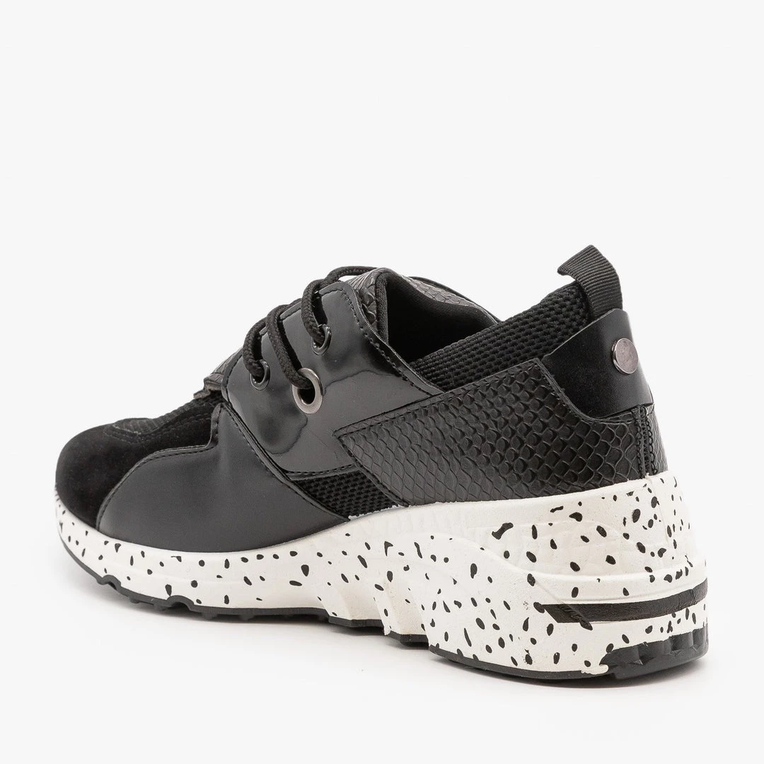 Get that 90s chic look in these La Sheelah Shoes Galaxy-01 sneakers! Made out of faux leather, these sneakers feature a classic lace-up style for easy on/off access and practical adjustment. The trendy chunky sole provides extra support and grip, while the cushioned insoles make these shoes extra comfy. Pair these sneakers with a silk midi slip dress and an oversized ribbed turtleneck for an ultra cool street style look! Made with all man-made/vegan materials and runs true to size.