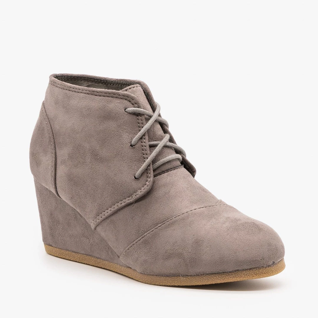 We can’t get enough of these adorable Lovmark Shoes Skye wedge heel booties! Crafted with soft faux suede, these beauties feature an approx. 2.5″ wedge heel to give you a little sass and and a stylish rounded toe. These cute booties are available in several lovely colors and can easily be dressed up or down depending on the occasion! Wear them with cuffed skinny jeans, a belt and a French-tucked sweater for a cozy everyday look or dress them up with a bodycon midi dress, tucked in bell sleeve shirt and your favorite statement jewelry! Made with all man-made/vegan materials and runs true to size.