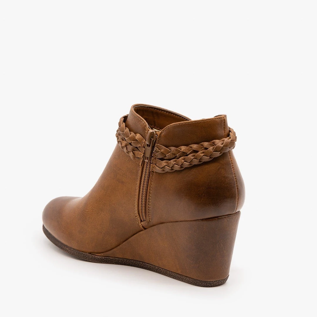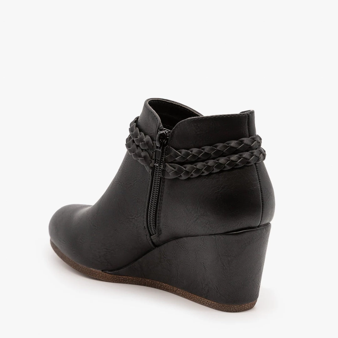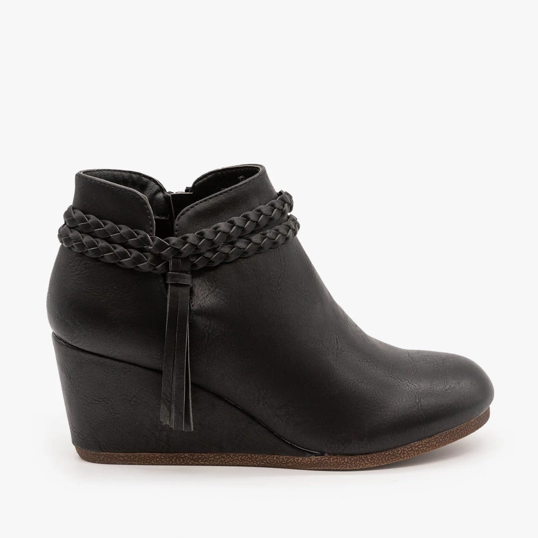 Walk the walk in these Mata Shoes Retro-1 wedge ankle booties! These lovely booties are made out of faux leather or faux suede (leopard) and feature a 3.5″ wedge heel for height and style. The burnished toe and heel design gives these shoes a vintage, distressed look, while the braided tassel accent around the ankle adds a trendy flair. The interior side zipper also provides easy on/off access. Pair these booties with some some high-waisted ankle jeans and a basic bodysuit for a cute weekend outfit! Made with all man-made/vegan materials.