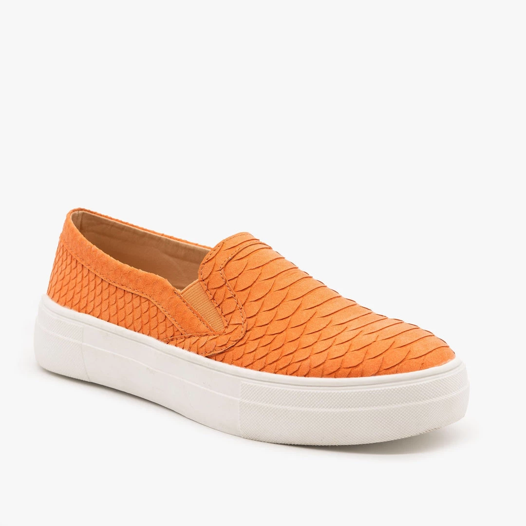 Give your wardrobe a pop of color with these vibrant Mata Shoes Coco-1A sneakers! Crafted with faux leather, these funky sneakers feature an abstract scaly design in bold orange, blue or green. The classic white foxing, rounded toe and simple slip on design balance out the bold colors and patterns, making this shoe the perfect balance between hip and timeless. For a fun everyday look, pair these sneakers with distressed high waisted jeans, a colorful silk top and some gold jewelry! Made with all man-made/vegan materials and runs true to size.