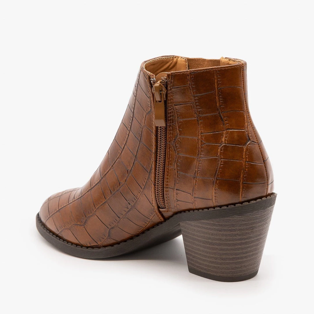 Spice up your shoe game with these Mata Shoes Celeste-3 booties! Fashioned from faux leather, these booties feature an approx. 3″ block heel and almond shaped toe, making them super stylish. A tan crocodile print gives these booties a little bit of edge and a laced and knotted detail on the side completes the look. An inner zipper makes these booties easy to slip on and off. Dress these booties up by pairing them with dark skinny jeans, a modern cut-out tee and a cropped leather jacket! Made with all man-made/vegan materials.