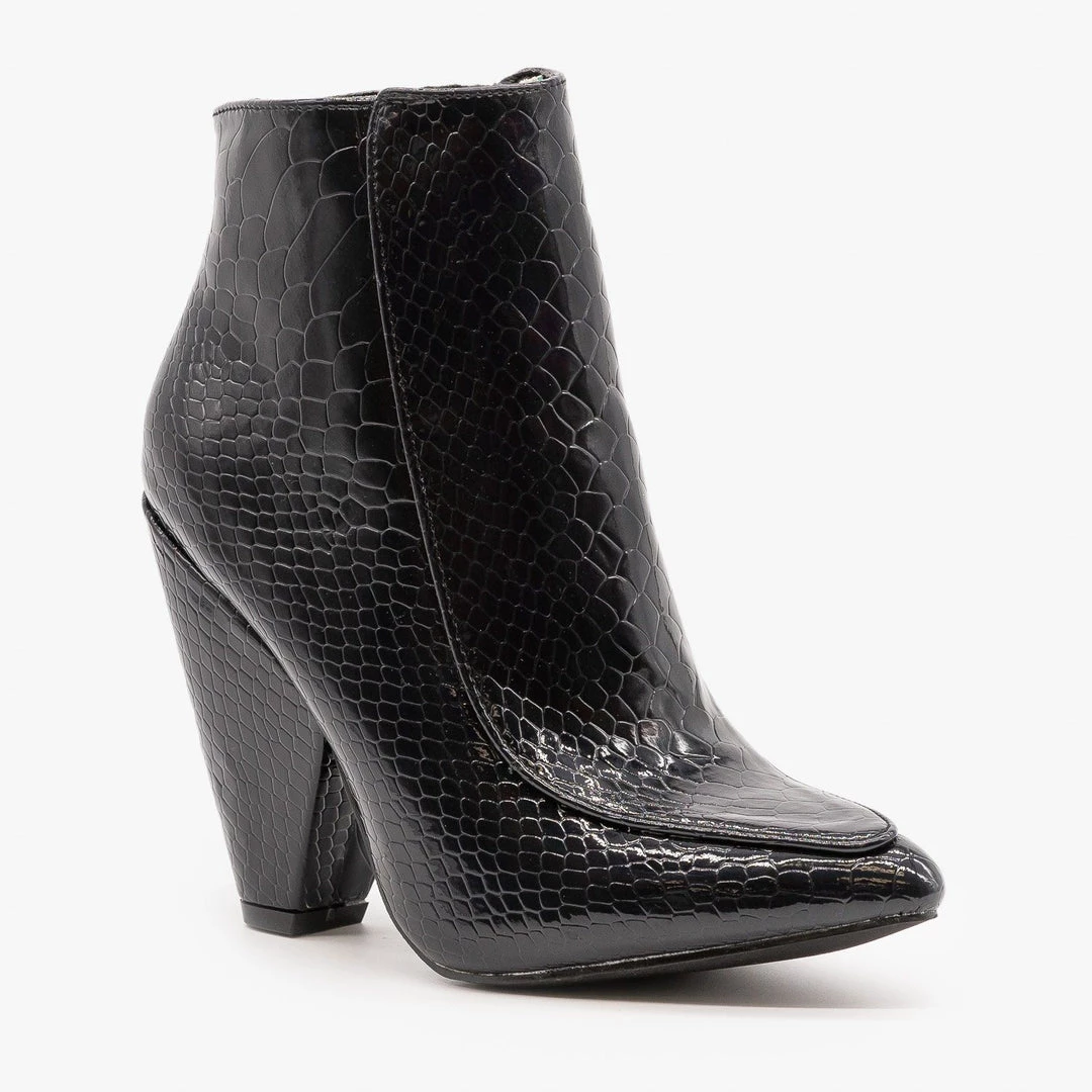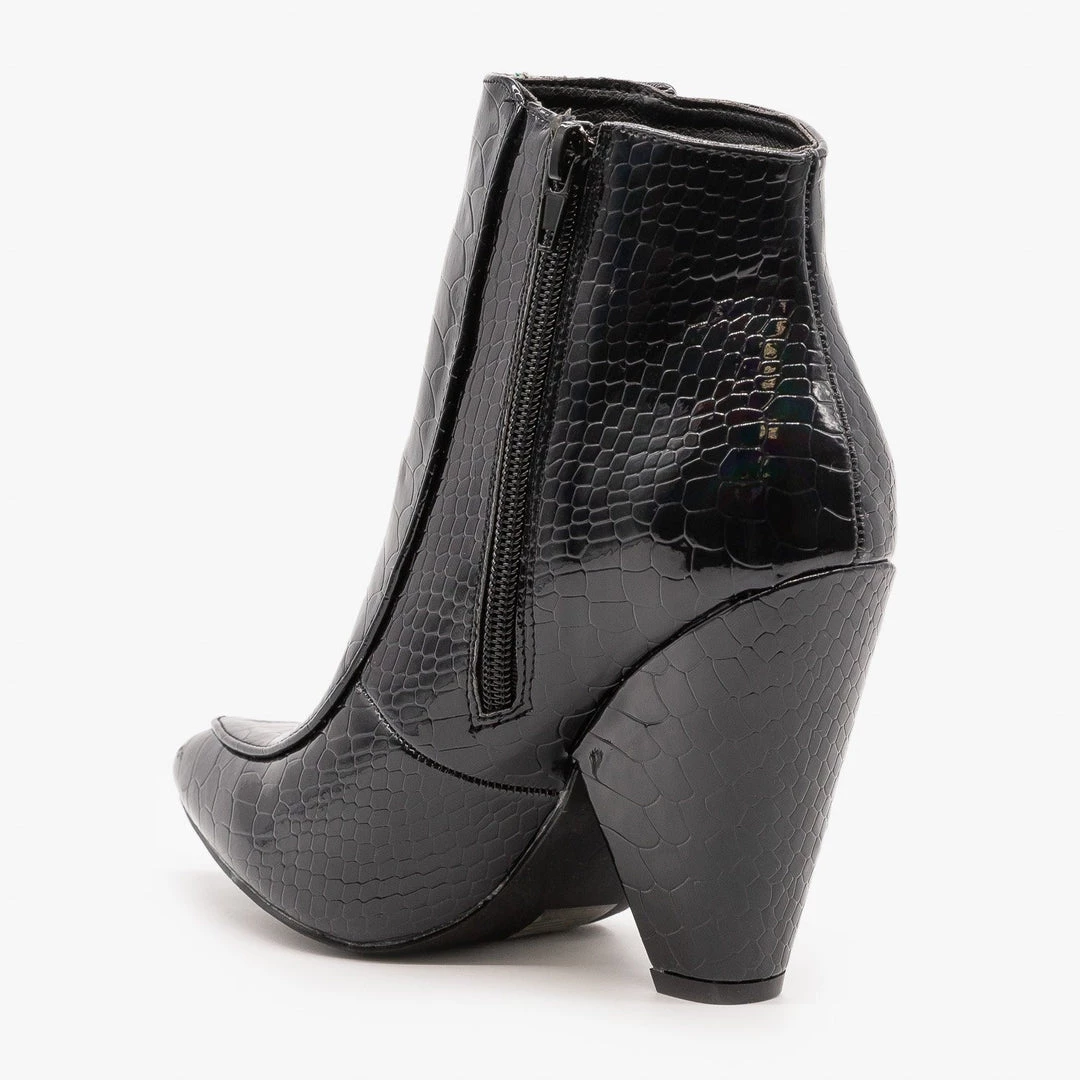 Get a party-ready look in these stunning python print Mata Shoes Vibe-1 booties! Crafted with faux leather, these booties feature an approx. 4.5″ angled heel and an upturned pointed toe to give you some serious attitude. The black python design makes these boots edgy and chic. These booties rise to just over the ankle and have a full-length inner zipper for easy on/off access. Pair them with a neon bodycon dress and gold hoop earrings for a sexy night out look! Made with all man-made/vegan materials and runs true to size.