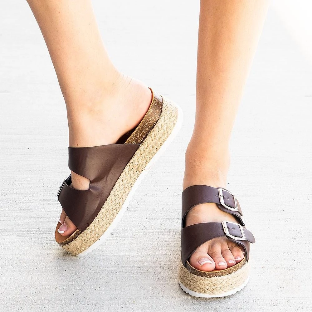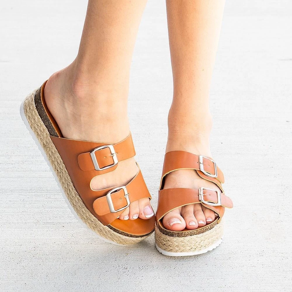 These double buckled Mata Iconic shoes will be the star of the show in any outfit you pair them with! They have a birken styled body made from a faux-leather material and have two adjustable buckles. They include a trendy espadrille platform that will add height and accentuate the legs! A rigid outer sole allows for proper grip for comfort in every step! Pair with distresses mom-fit jeans and a tucked in camisole and matching hand bag for an effortless look.Â
