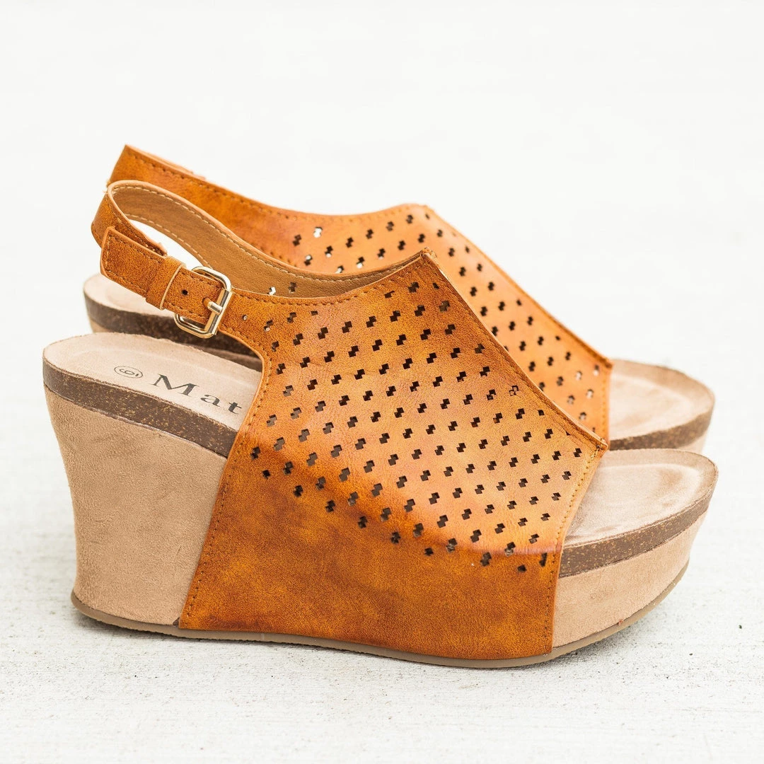 Turn heads in these beautiful Mata Shoes Laura-5 platform wedges! Crafted out of faux leather, these wedges feature an adjustable slingback-style ankle strap for easy on/off access and support. The open toe design gives these shoes a trendy look, while the laser cut design adds some edge to these fashionable shoes. The cushioned insoles make these shoes comfortable enough to wear all day long, while the 4″ platform wedge adds maximum height. Wear these wedges with some high-waisted raw hem ankle jeans and an off-the-shoulder bodysuit for a cute and sexy look! Made with all man-made/vegan materials.