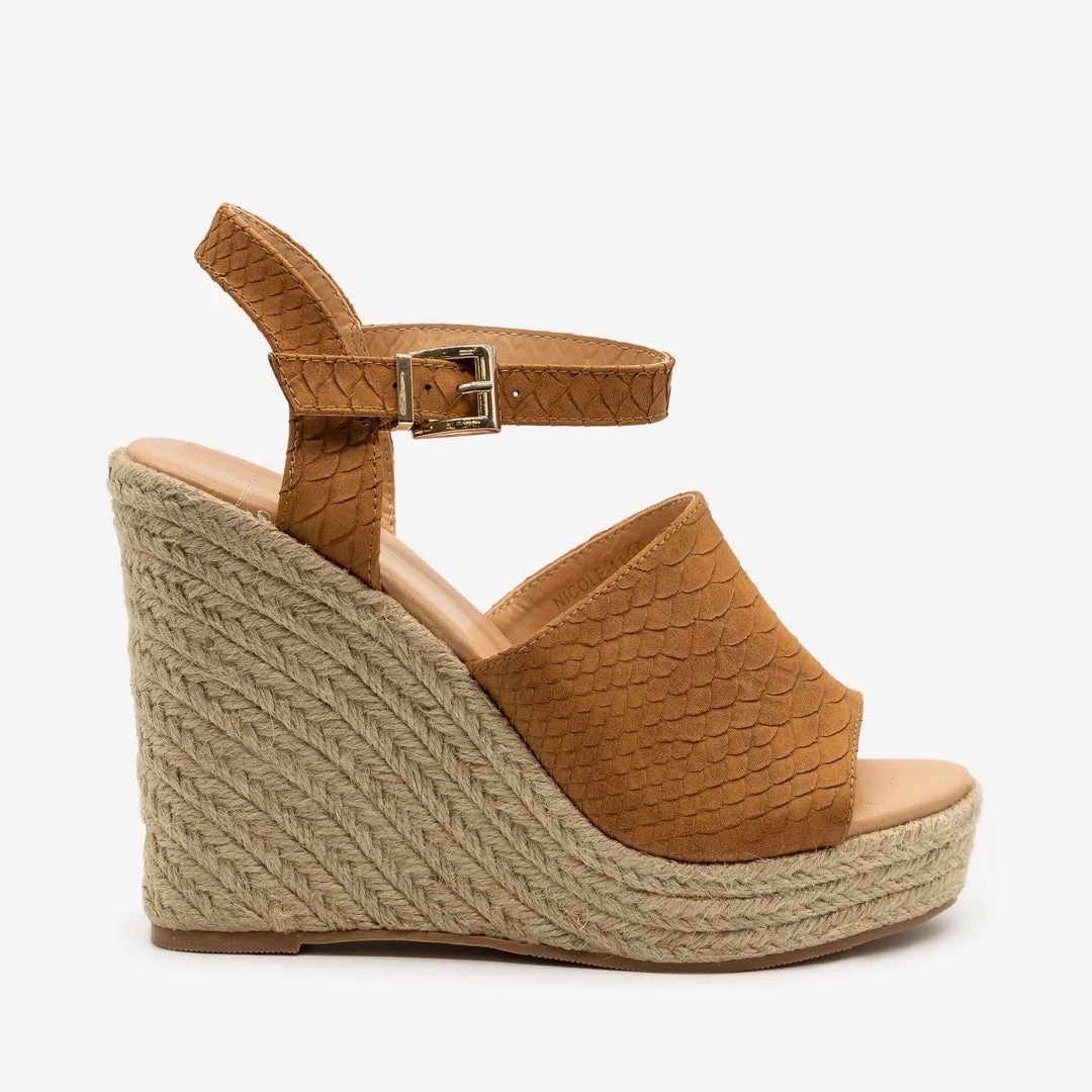 Add some serious style to your look with these Mata Shoes Nicole-11 wedges! Designed with faux leather, these wedges feature an approx. 4″ wedge heel trimmed entirely in espadrille for a trendy spring look. The body features a chic snake print with a matte finish in either taupe, tan or black. It has an open toe, a slingback strap and an ankle strap that clasps with an adjustable buckle. Pair these lovely wedges with wide leg black denim and a knotted tee for a super cute summer style. Made with all man-made/vegan materials and runs true to size.