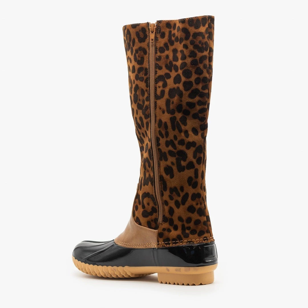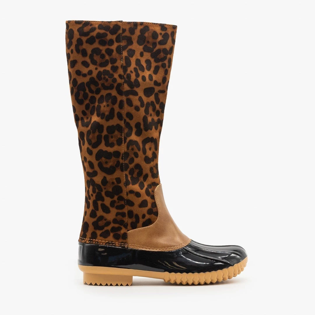 Make a wild splash with these Mata Shoes Duck boots! These trendy duck boots are made out of faux leather with ridged rubber soles to keep you supported and sturdy in any weather. The foot of the boot is a classic duck boot design while the body of the boot rises to the mid calf and features a fun animal print design of black or beige snake, crocodile or leopard! Pair these boots with some cozy socks, your favorite leggings, a sweater and a rain jacket to stay stylish yet dry on a rainy day! Made with all man-made/vegan materials and runs one half size small. Our model is a size 7 and would prefer a size 7.5