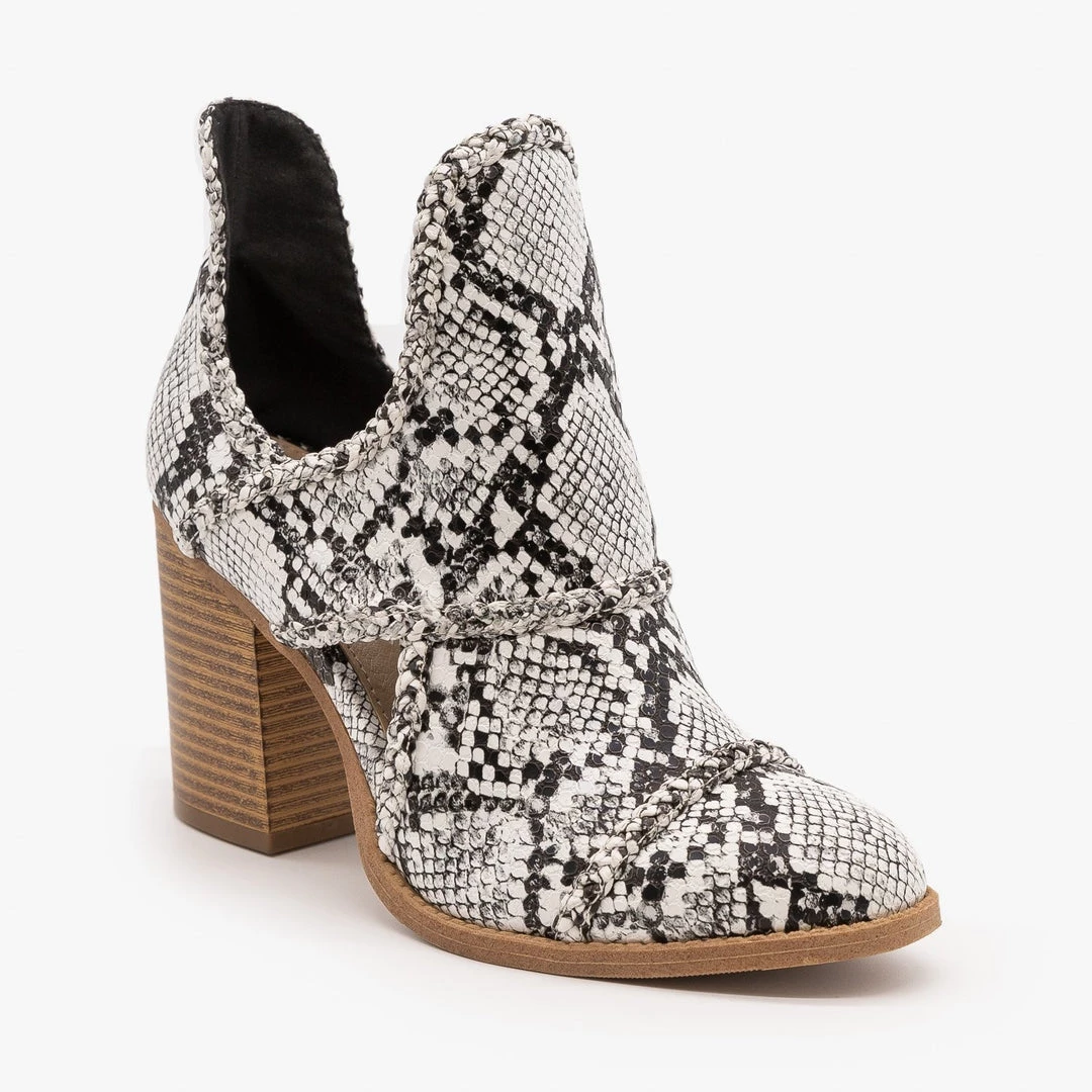 Mata Newest Arrivals Braided Trim Snakeskin Cutout Booties