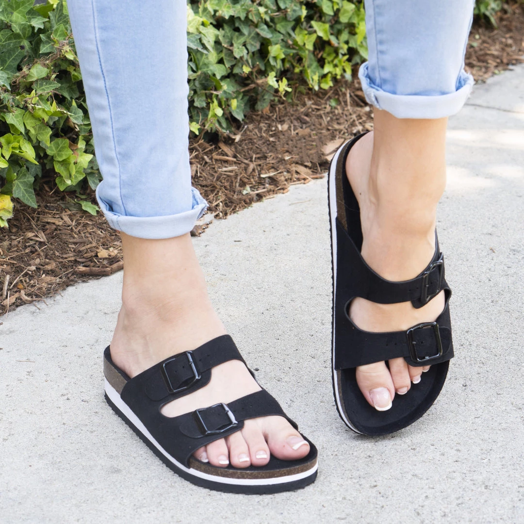 Looking to stay cute and comfy all year long? Then our Mata Heat Wave slides are the shoes for you! They feature an easy slip-on design with a birken styled body and are crafted from a faux-suede material. They have a small cork sole that add style and comfort to any look. Pair with mom jeans and an off the shoulder basic T for a casual day time fit.Â